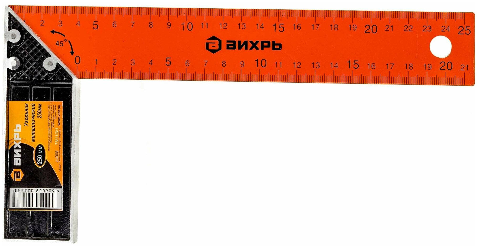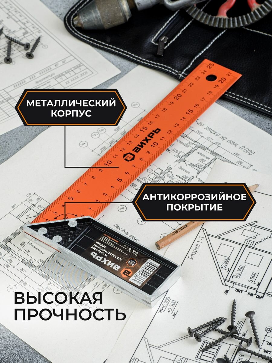 **Угольник Вихрь** используется для работы с заготовками из металла и дерева. На поверхность нанесена разметка для высчитывания расстояния. Позволяет измерять углы в 45° и 90°. Отличается устойчивостью к внешним воздействиям, деформации и коррозии.