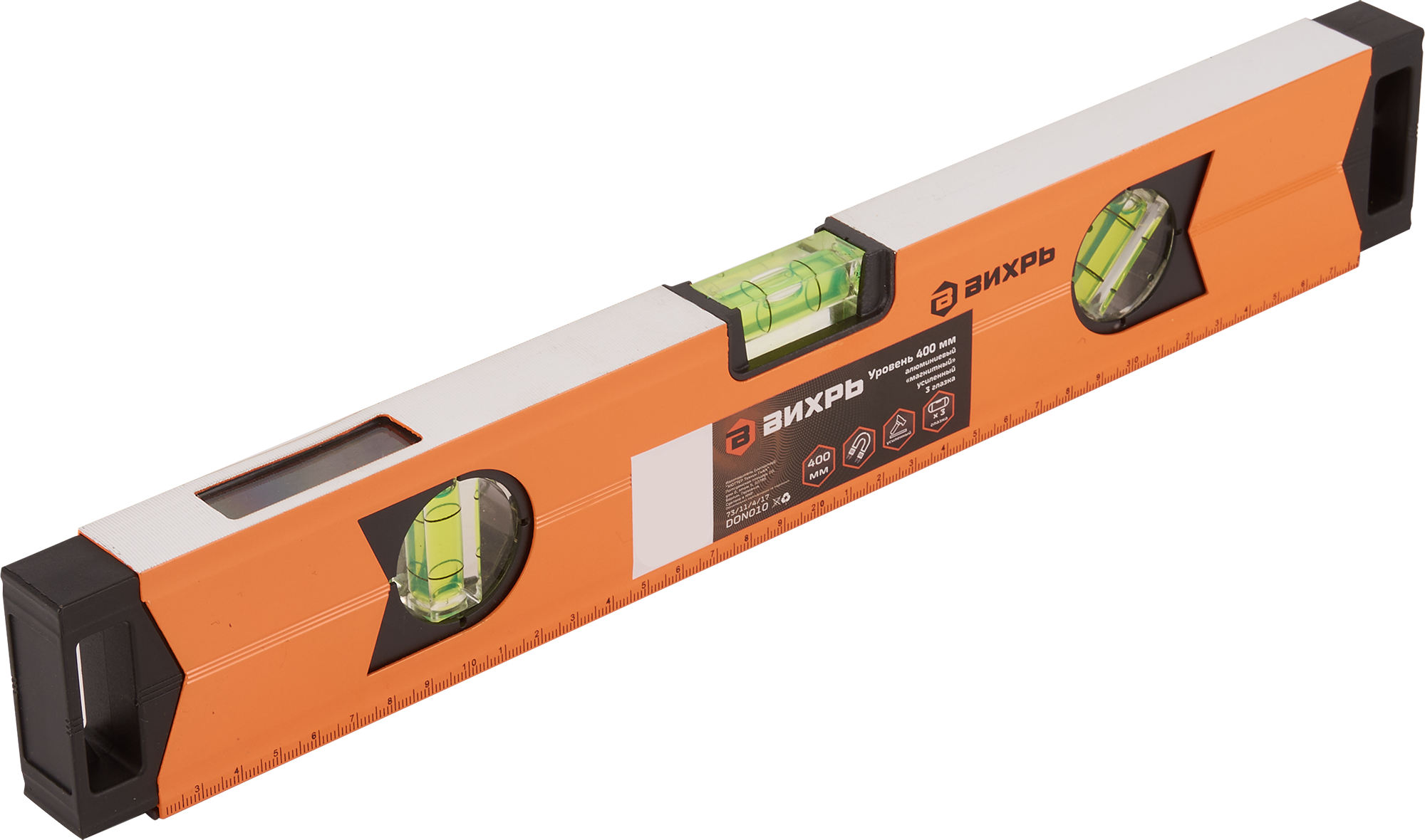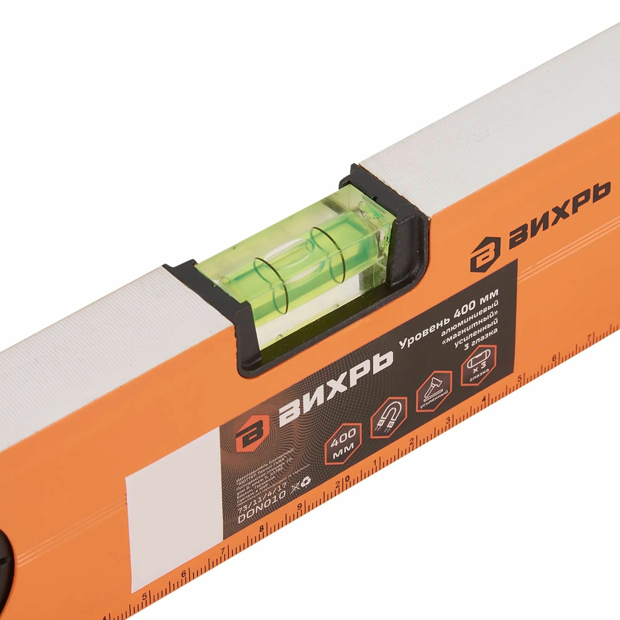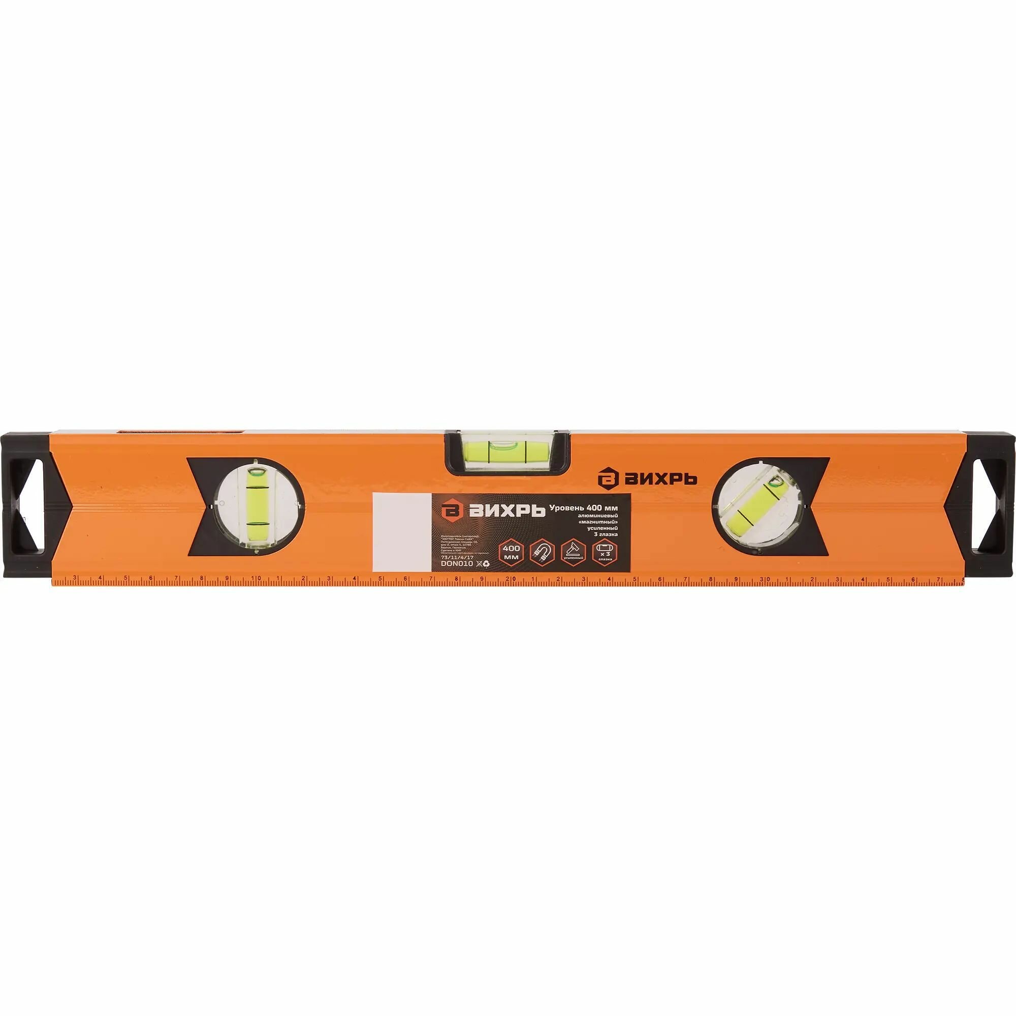 **Уровень пузырьковый Вихрь** — усиленный инструмент с 3 глазками, имеющий простую и функциональную конструкцию. В основе лежит рейка, изготовленная из алюминия. В корпусе предусмотрены специальные ампулы — основная и наиболее важная часть инструмента. Они заполнены специальной жидкостью с небольшим количеством воздуха, которая не замерзает при отрицательных температурах и имеет низкую вязкость. Последнее свойство необходимо, чтобы пузырек воздуха внутри емкости мог быстро перемещаться.