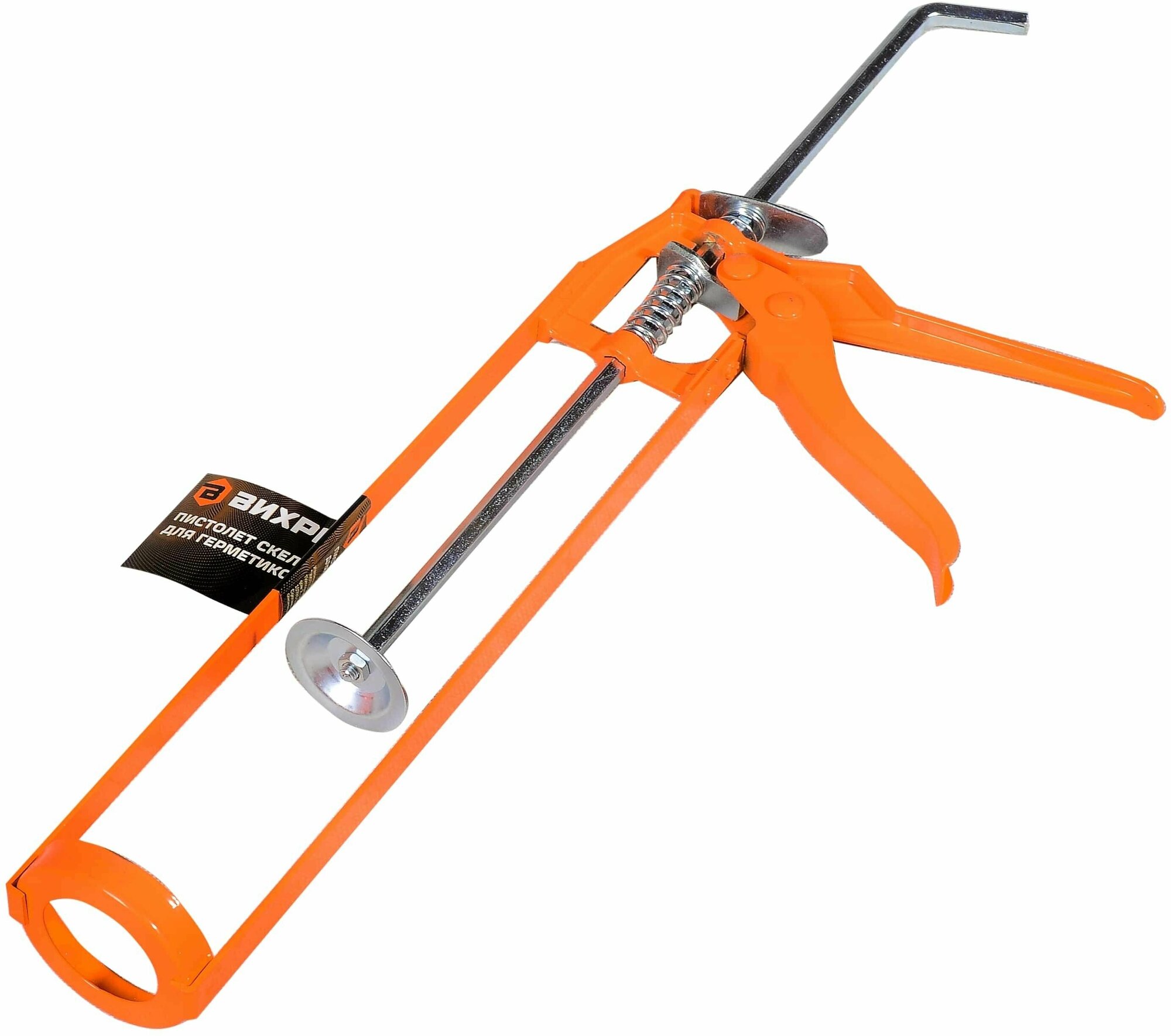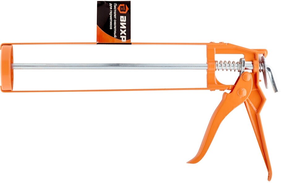 **Пистолет для герметика скелетный Вихрь** предназначен для упрощения нанесения герметика, клея, расфасованных по тубам. Отличается простотой эксплуатации. Удобно лежит в руке, не выскальзывает. Изготовлен из металла. Обладает поверхностью серого и оранжевого цветов. После проведения работ легко очищается от состава водой.