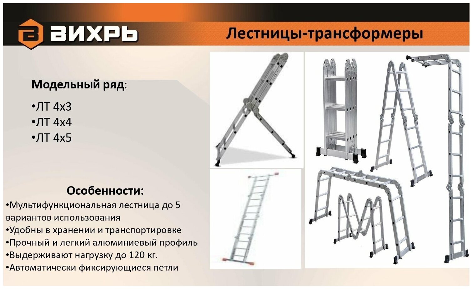 Лестница-трансформер Вихрь ЛТА 4х3 подходит для строительства и ремонта, а также для выполнения бытовых работ. Легко трансформируется. Устойчивость конструкции обеспечивается широкой траверсой, равномерно распределяющей нагрузку, и антискользящими башмаками. Лестница занимает мало места при хранении и транспортировке благодаря съемной траверсе.
