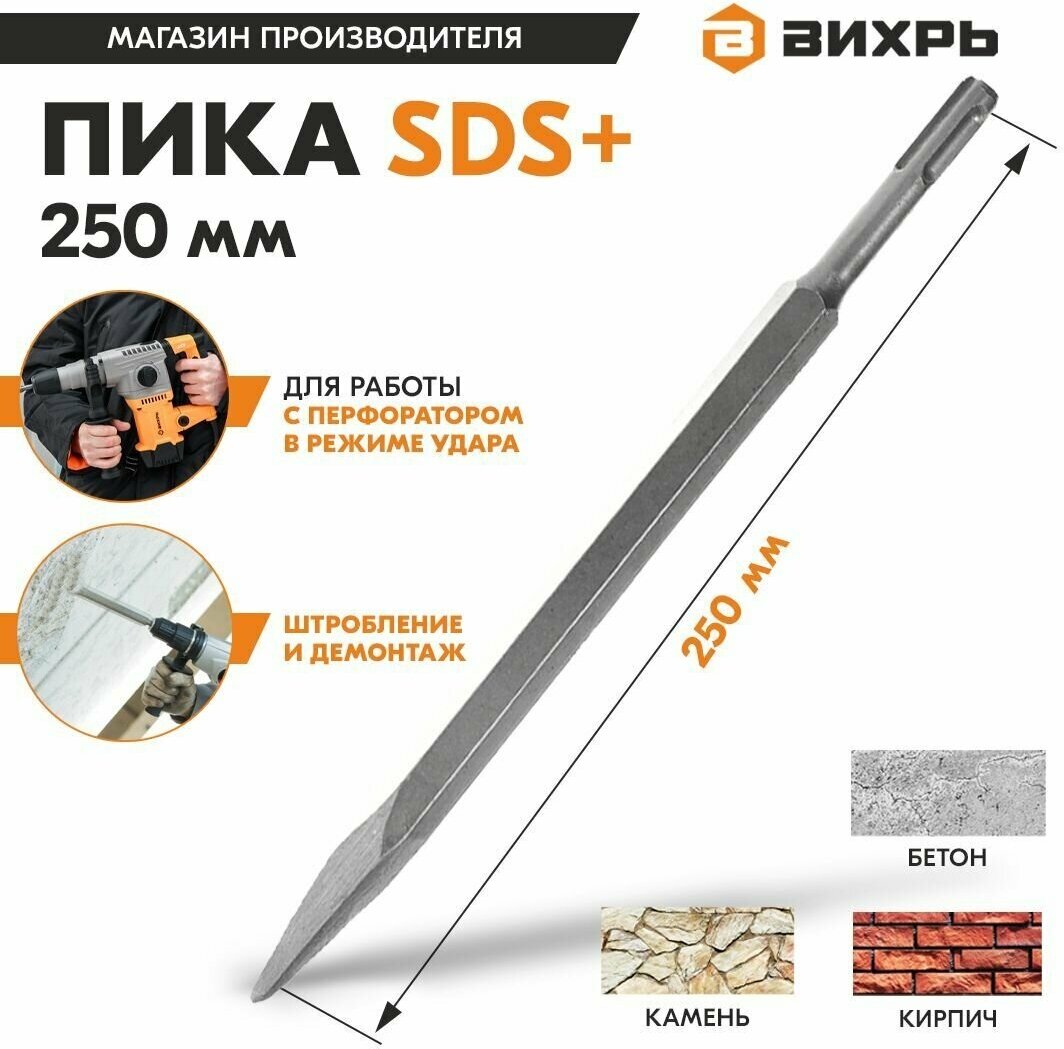 Пика по бетону Вихрь , длина = 250мм, в комплекте 1 предм., для перфораторов