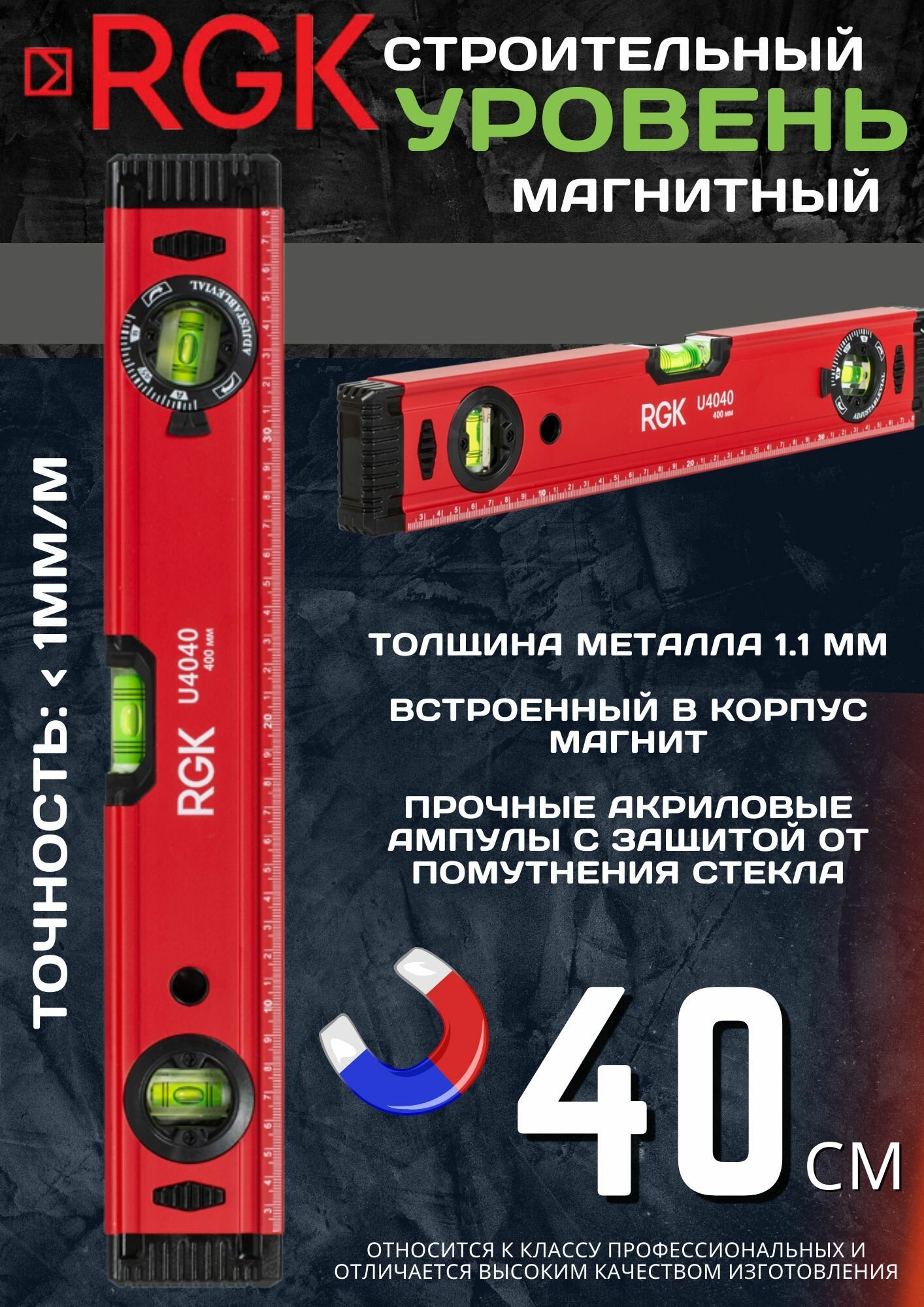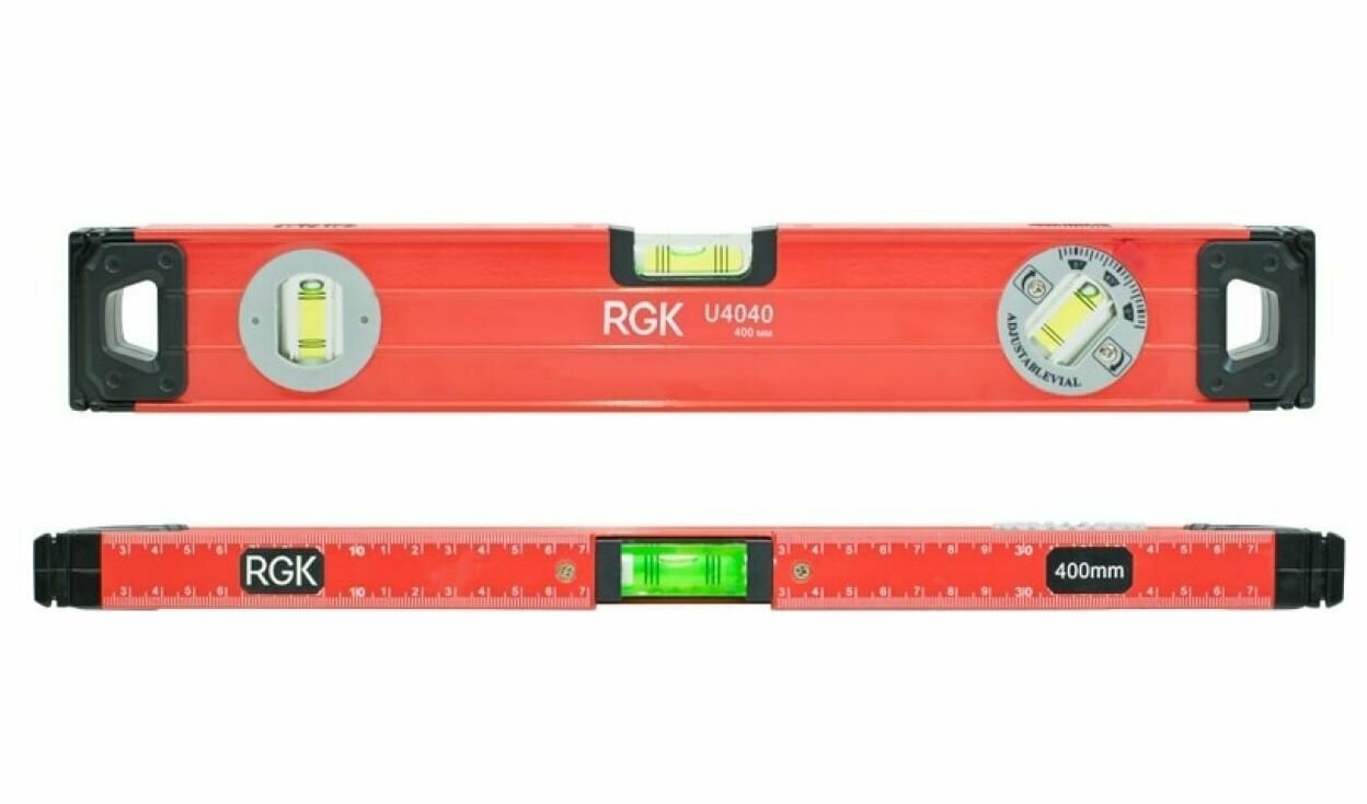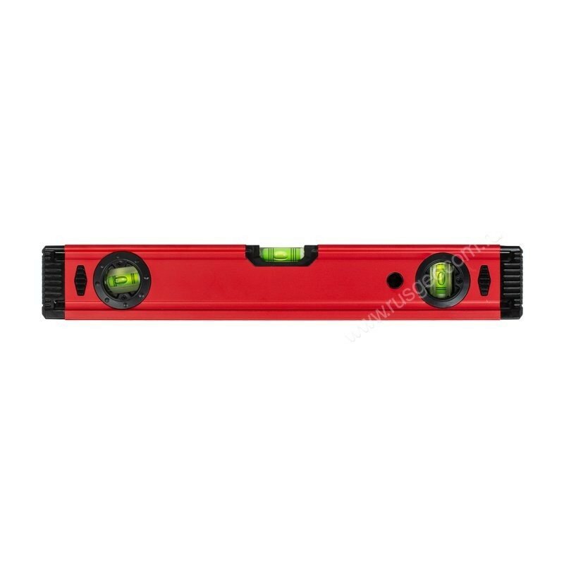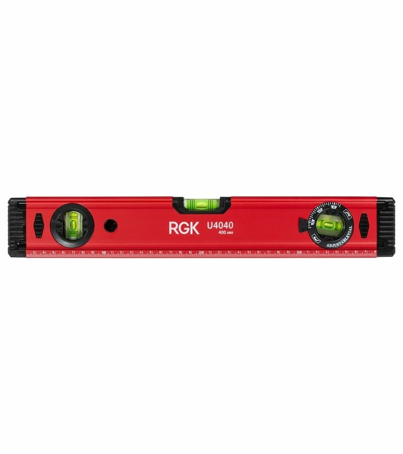 Линейка с ценой деления шкалы 1 мм сделает удобной разметку поверхностей. Подписи и отметки шкалы белого цвета на строительном уровне RGK выполнены методом гравировки и не истираются при контакте с такими поверхностями, как бетон или дерево. Металлический корпус строительного уровня RGK имеет толщину стенок 1.1 мм. За счет этого, корпус не меняет форму и не гнется в течение всего срока использования, в том числе, после падения. Боковые вставки из ударопрочного пластика защищают строительный уровень RGK от повреждений при падении на твердую поверхность. Стекло ампул выполнено из акрила, за счет чего ампулы не протекают и не мутнеют в течение срока службы.
