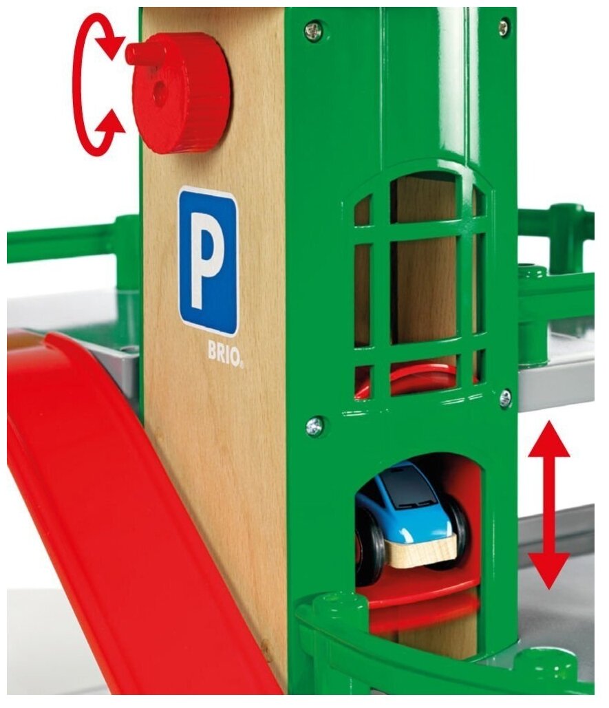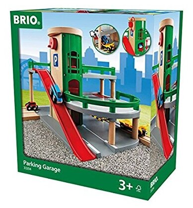 BRIO 33204 Парковка набор из знаменитой серии! Великолепный гараж изготовлен из дерева и пластика. Два этажа, и трап, чтобы скользить вниз. В общей сложности 7 частей. Рекомендуется для детей старше 3 лет.