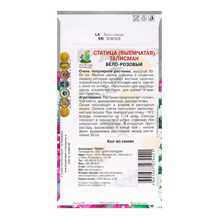 Для растения подходит рыхлая почва и хорошо освещенные места. Посев производят в апреле в рассадные ящики. Семена присыпают песком или земляной смесью. Периодически проверяют влажность и грунт на наличие плесени. При температуре почвы +18 С всходы появляются на 7-14 день. Сеянцы пикируют в горшки по 3 штуки, содержат при умеренной температуре. Растение быстро разрастается, не стоит затягивать с высадкой. В открытый грунт рассаду высаживают, когда пройдет угроза резкого понижения температуры ночью. Рекомендуется дождаться конца мая - начала июня. При посадке необходимо соблюдать расстояние между саженцами не меньше 30 см. Почва вокруг статицы нуждается в периодических подкормках и рыхлении вокруг куста. Достаточно редких поливов.