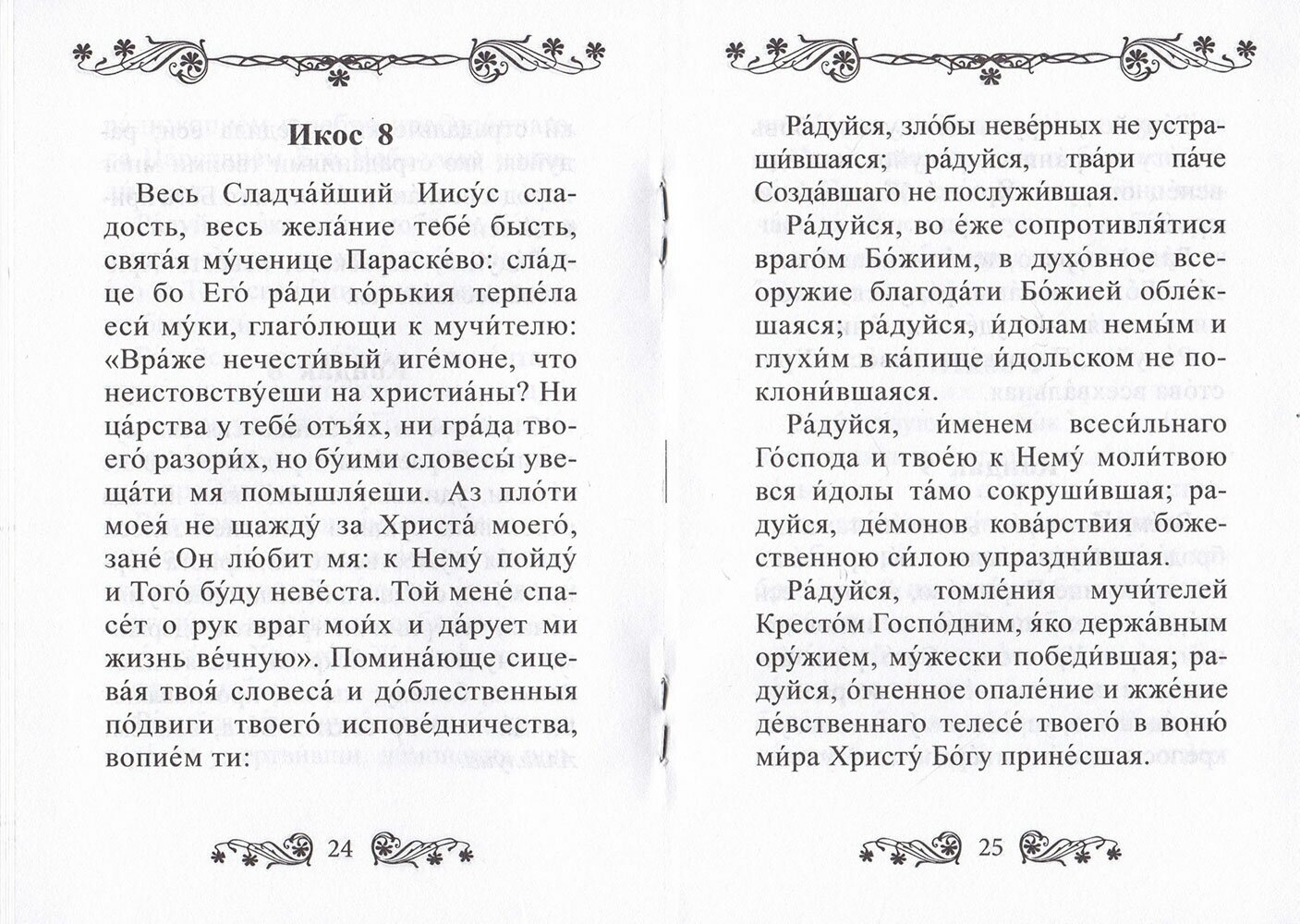 В этом акафисте мы просим о помощи и заступлении святую Параскеву. Она жила в третьем веке и претерпела мученическую кончину при императоре Диоклетиане. Ее память 10 ноября (28 октября по старому стилю). Чаще всего молятся святой Параскеве женщины. Ее просят в самых разных нуждах и проблемах. Девицы чаще всего просят помощи в поиске хорошего жениха и сохранении целомудрия до брака. Женщины обращаются к ней с молитвой о благополучии в доме, об исцелении женских недугов и бесплодия, о вразумлении и наставлении детей. Однако Параскева не только женщинам помогает. Она считается также покровительницей торгового дела и портных.Вашему вниманию предлагается издание Акафист святой великомученице Параскеве Пятнице . Великомученица Параскева считается покровительницей полей и скота. Она является также целительницей людей от самых тяжелых душевных и телесных недугов