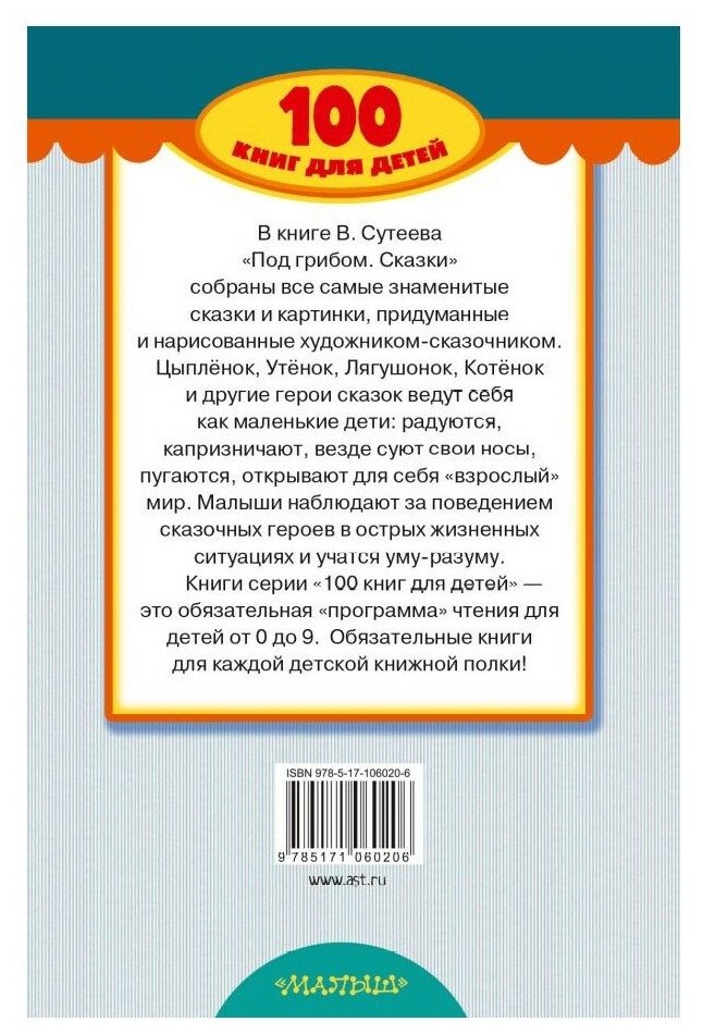 НОВАЯ СЕРИЯ: «100 книг для детей» – это обязательная «программа» чтения для детей от 0 до 9. Обязательные книги для каждой детской книжной полки. В книге В.Г. Сутеева «Под грибом. Сказки» собраны все самые знаменитые сказки и картинки, придуманные и нарисованные художником-сказочником. Цыплёнок, Утёнок, Лягушонок, Котёнок и другие герои сказок ведут себя как маленькие дети: радуются, капризничают, везде суют свои носы, пугаются, открывают для себя «взрослый» мир. Малыши наблюдают за поведением сказочных героев в острых жизненных ситуациях и учатся уму-разуму.