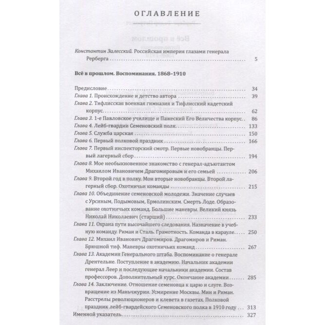 "Мои воспоминания о жизни и службе в прежней, ныне погибшей, старой и славной Родине, нашей Великой Императорской России", - такое предпослание дает Рерберг своей книге и с первой и до последней строчки ему верен . Это рассказ честного старательного русского офицера и патриота. Книга интересно читается не только знатоком военного дела, но и любым человеком, которому интересен армейский быт и жизнь последней четверти 19 - начала 2О вв. Автор приводит много занятных , ныне забытых, жизненных, бытовых подробностей, которые практически всегда поданы сквозь призму его личностного восприятия. Так читателю удается взглянуть на дореволюционную Россию живыми глазами её современника. Рерберг честен, объективно рассказывает о себе и своем окружении, не приукрашивая и не лакируя личных качеств и социальных отношений. Кстати, в этом плане интересны подробности его общения с генерал-адъютантом М. Драгомировым и его семьей.( этой теме посвящена целая глава) Для изучающих историю армии будут небесполезны подробные поименные списки, а порой и характеристики, служивших с ним в знаменитом Семеновском полку офицеров.