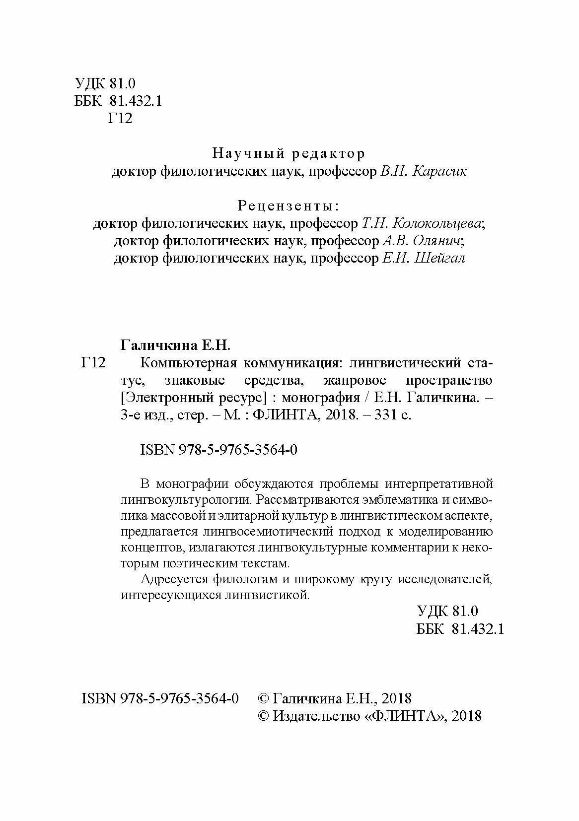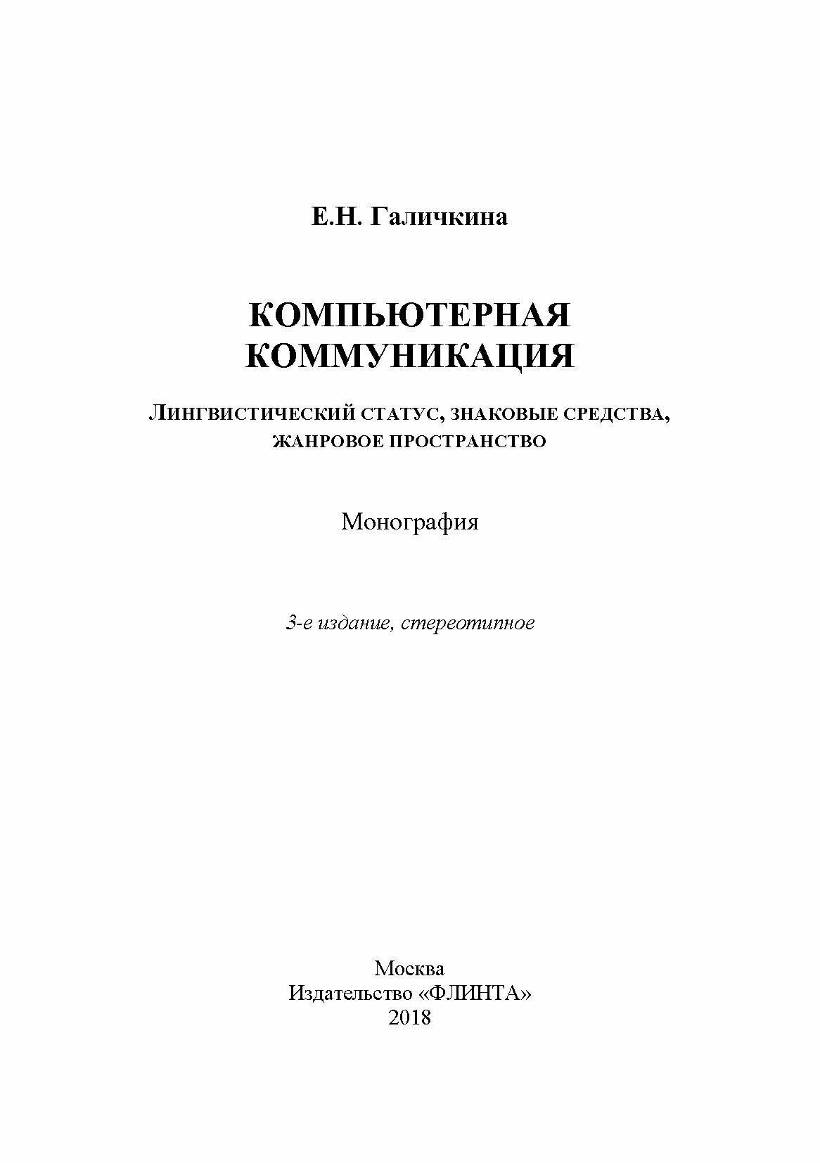 Компьютерная коммуникация. Лингвистический статус знаковые средства жанровое пространство (Е. Н. Галичкина); ФЛИНТА, 2018