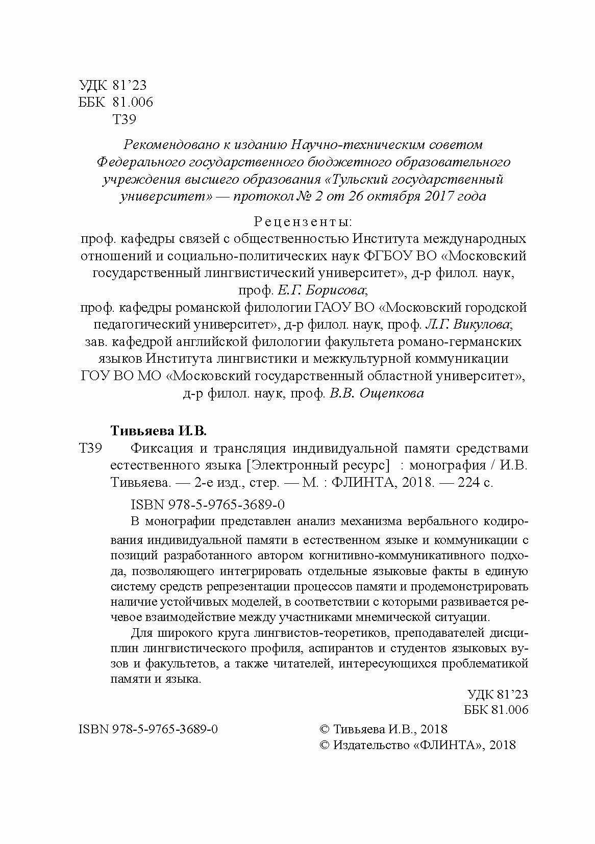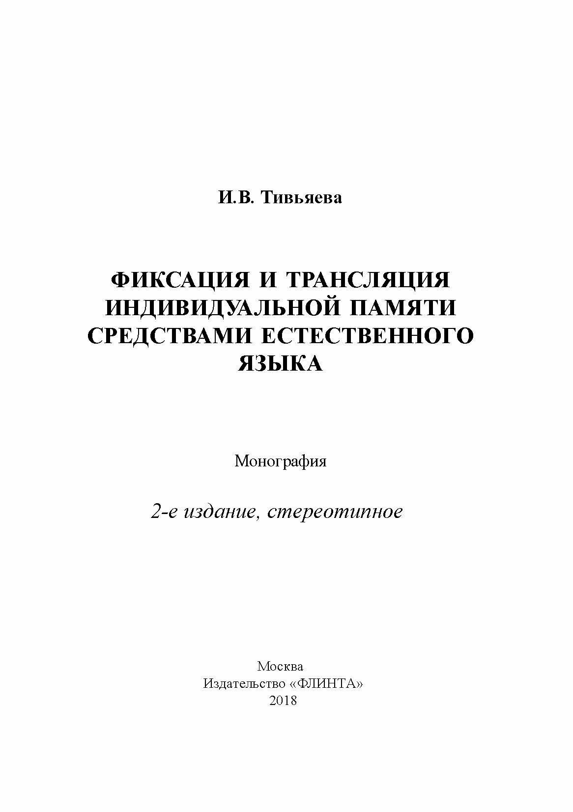Фиксация и трансляция индивидуальной памяти средствами естественного языка. Монография (И. В. Тивьяева); ФЛИНТА, 2018