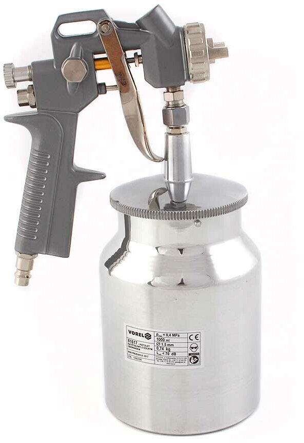 Пистолет-распылитель с нижним бачком применяется для нанесения лакокрасочных материалов (лак, олифа, краска, грунтовка,эмаль, клей и др.) на поверхности из пластика, металла, дерева, керамики. Используется в строительстве, мебельной промышленности, автомобильном сервисе и т. д. Характеристики: объем бачка -1000 см?; максимальное давление - 3,5-5 Bar; расход воздуха - 280-450 л/мин; диаметр воздушного соединения — 1/4"; диаметр сопла — 1,5 мм.