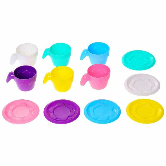 Набор посуды понравится каждой девочке, которая любит собирать за столом дружную компанию игрушек или приглашать подружек на чаепитие. Малышке будет приятно угостить всех чаем и хорошо провести время за интересной беседой. Необычная форма и яркие цвета чашек и блюдец позволит использовать набор для детских праздников. Посуда изготовлена из пластика, не содержащего токсины.