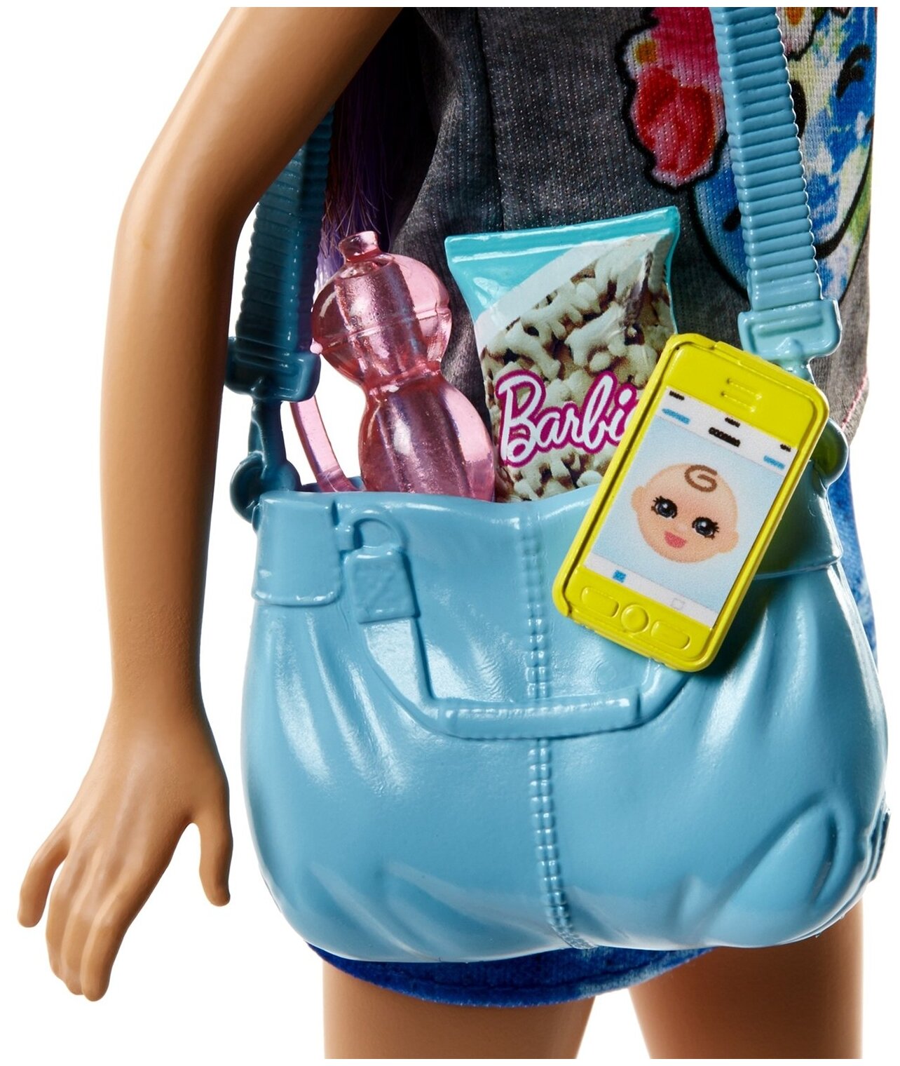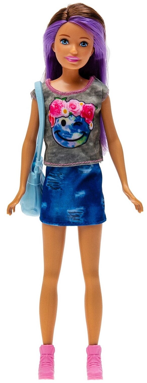 У Барби смуглая кожа, голубые глаза и каштановые волосы с фиолетовыми прядями, которые можно расчесывать. На ней надета серая футболка с рисунком, синяя джинсовая юбка, розовые кеды и голубая сумка на одно плечо. Такой удобный наряд отлично подойдет Барби, чтобы погулять со своей младшей сестренкой.