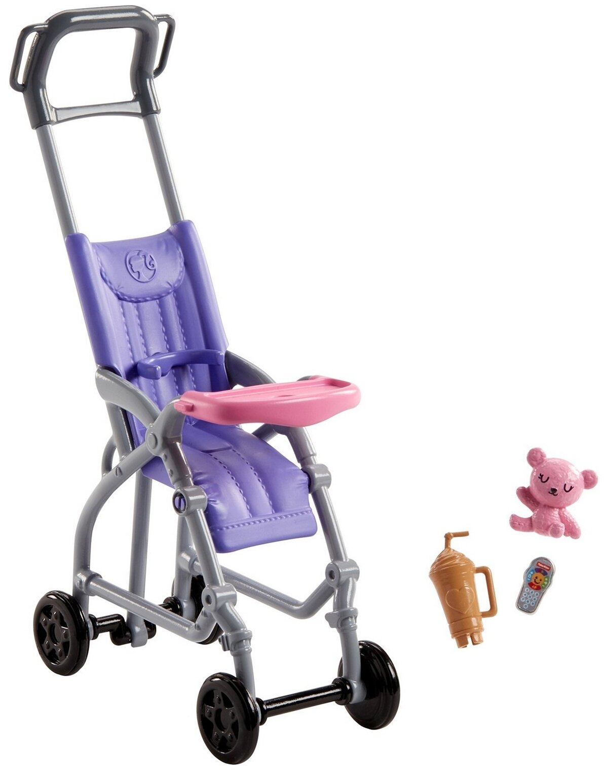 Если малышка устанет, её можно посадить в фиолетовую коляску с вращающимися колёсами. А еще дать ей игрушку или бутылочку.