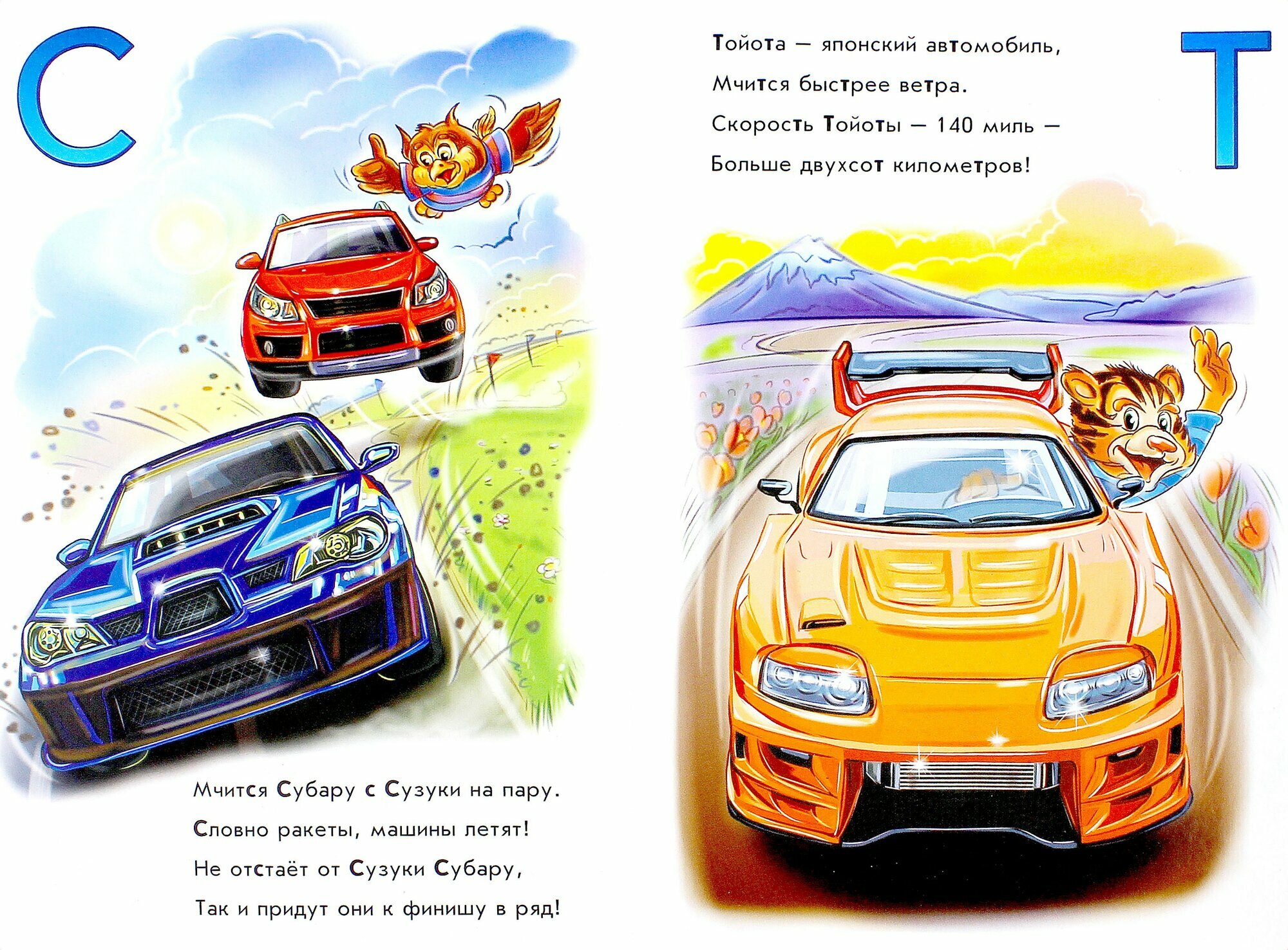 На каждой страничке этой книжки ребёнок познакомится с одной буквой, найдёт изображение одной из известных марок машин и множество предметов и персонажей, названия которых начинаются с этой буквы!