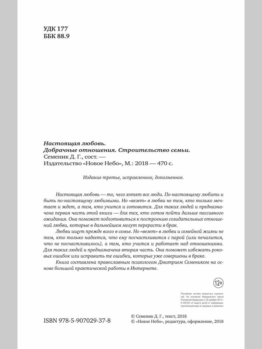 Настоящая любовь — то, чего хотят все люди. По-настоящему любить и быть по-настоящему любимыми. Но «везет» в любви не тем, кто только мечтает и ждет, а тем, кто учится и готовится. Для таких людей и предназначена первая часть этой книги — для тех, кто готов пойти дальше пассивного ожидания. Она поможет подготовиться к построению созидательных отношений любви, которые в дальнейшем могут перерасти в брак. Любви ищут прежде всего в семье. Но «везет» в любви и семейной жизни не тем, кто только надеется, что ему посчастливится с парой (или печалится, что не посчастливилось), а тем, кто учится и работает над отношениями. Для таких людей и предназначена вторая часть. Она поможет избежать роковых ошибок или исправить те ошибки, которые уже совершены в браке.