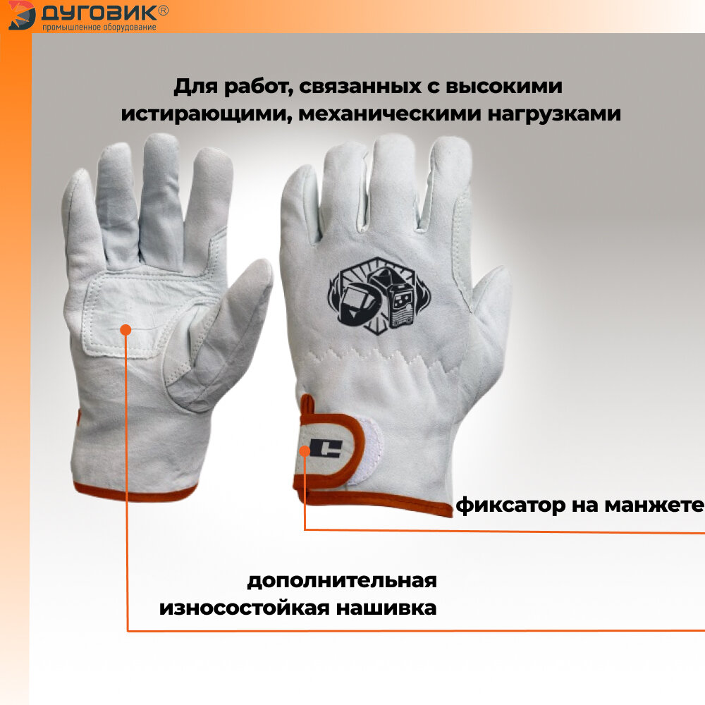 Рабочие перчатки из натуральной кожи имеют фиксатор на манжете, что обеспечивает лучшую посадку на руке. Ладонь дополнительно укреплена износостойкой нашивкой. Сфера использования: для работ, связанных с высокими истирающими, механическими нагрузками.