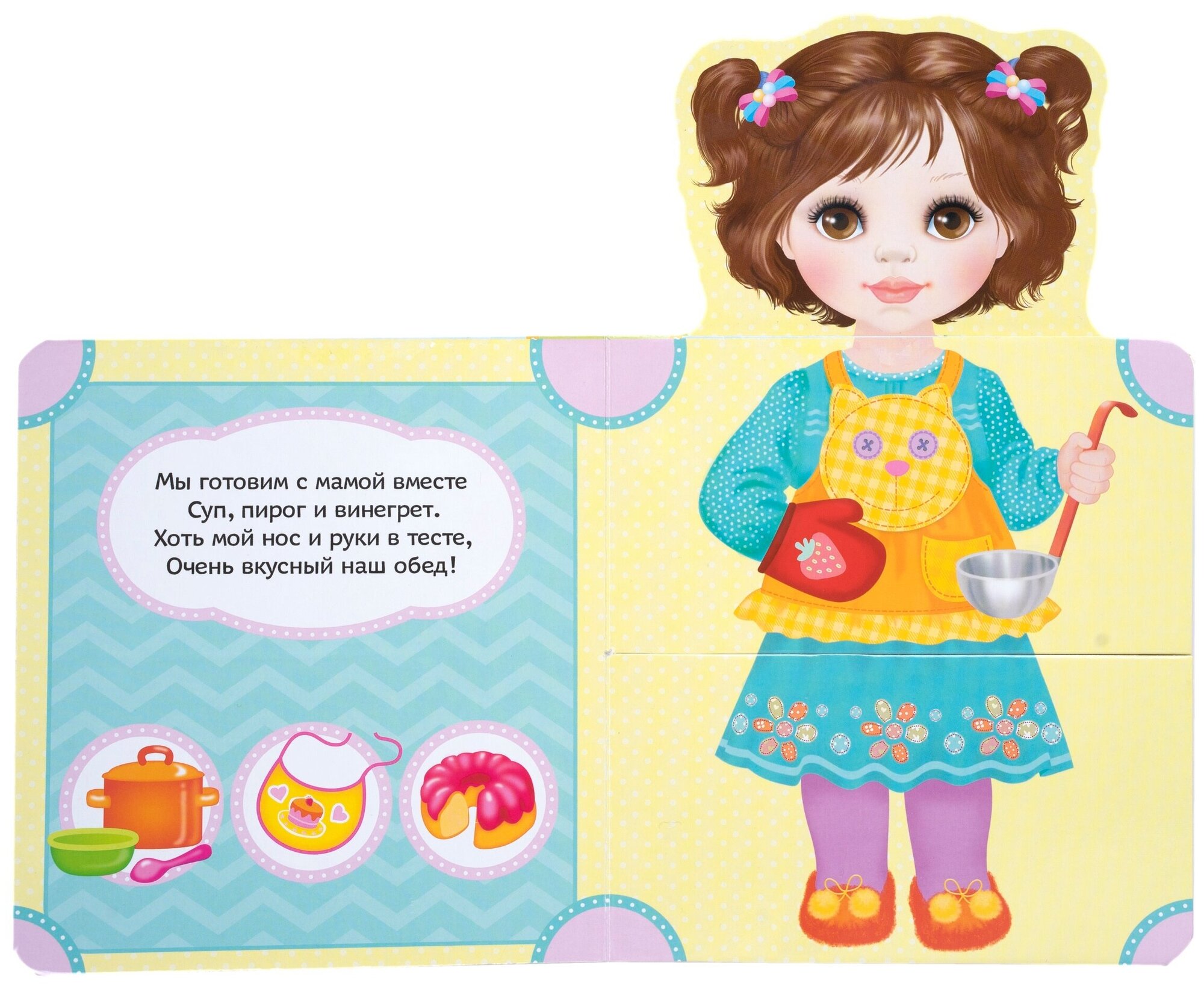 На каждом развороте кукла-подружка изображена в новом наряде. Страницы разделены пополам таким образом, что предметы одежды можно комбинировать. Фигурная контурная вырубка, нежные симпатичные иллюстрации, вырубка в блоке. Играя с этими чудесными книжками, девочки с удовольствием будут подбирать куклам-подружкам новые яркие одежки, читать им веселые стихотворения и находить изображения предметов, подходящих к каждому наряду.