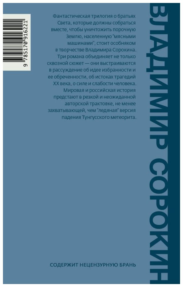 Дети Льда Они могут общаться друг с другом без слов, они проникли во все страны и во все организации, они хотят уничтожить всех, кто от них отличается. Три ярких, шокирующих и с непревзойденным мастерством написанных романа от одного из главных возмутителей спокойствия в русской литературе. Любое произведение Владимира Сорокина неизбежно вызывает настоящую бурю, причем далеко не только в окололитературных кругах. Его полемические, шокирующие и не признающие никаких рамок романы вызывают самые разные чувства, от восторга и обожания до неприятия и глубочайшего возмущения. И совершенно точно, как бы вы ни относились к творчеству Сорокина, при изучении современной литературы пройти мимо этой трилогии не удастся никак. История о космической субстанции, попавшей на Землю вместе с метеоритом, и о людях, этой субстанцией пробужденных, получилась по-сорокински глубокой, гротескной и полной аллюзий. Здесь и тайный орден сверхлюдей, считающих всех остальных «мясными машинами», и столкновение элитаризма с обществом потребления, и политическая сатира. Высокое соседствует с низким, сакральное с плотским, а границы доступного, как и понятие нормы, максимально размыты. Ну и, конечно, традиционные знаки отличия сорокинской прозы: великолепный стиль, яркие диалоги, захватывающий и совершенно непредсказуемый сюжет, объединяющий все три романа.