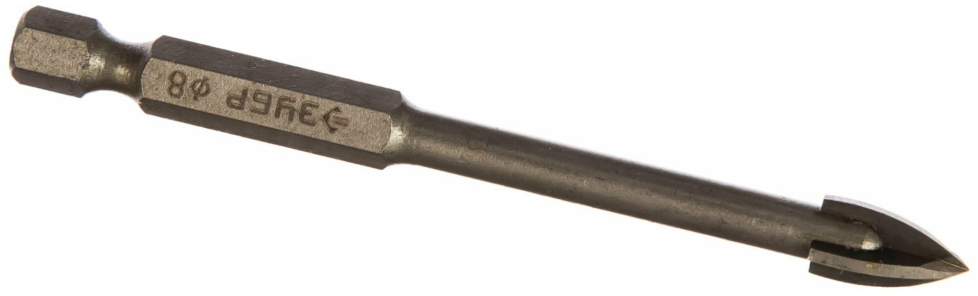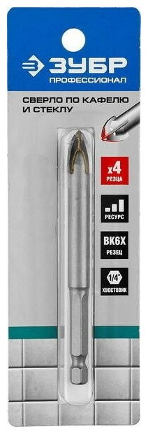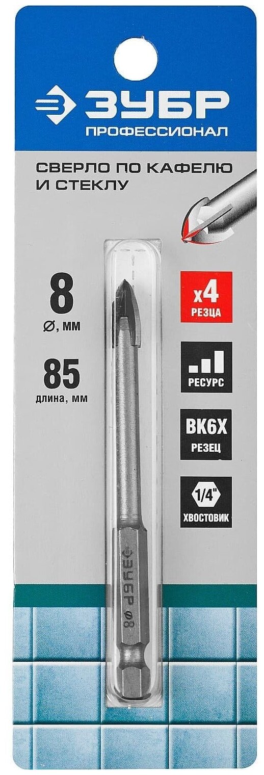 Сверло по кафелю и стеклу 8 мм ЗУБР применяется для сверления отверстий в стекле, керамической и кафельной плитке, мраморе. Четыре резца. Благодаря четырём режущим лезвиям сверление осуществляется в два раза эффективней. Наконечник сверла из твердого сплава BK6Х. Специальная заточка режущих кромок улучшает прохождение материала. Шестигранный хвостовик для предотвращения проворачивания в сверлильном патроне. Специальная проточка хвостовика 1/4" для использования быстросъемных адаптеров.