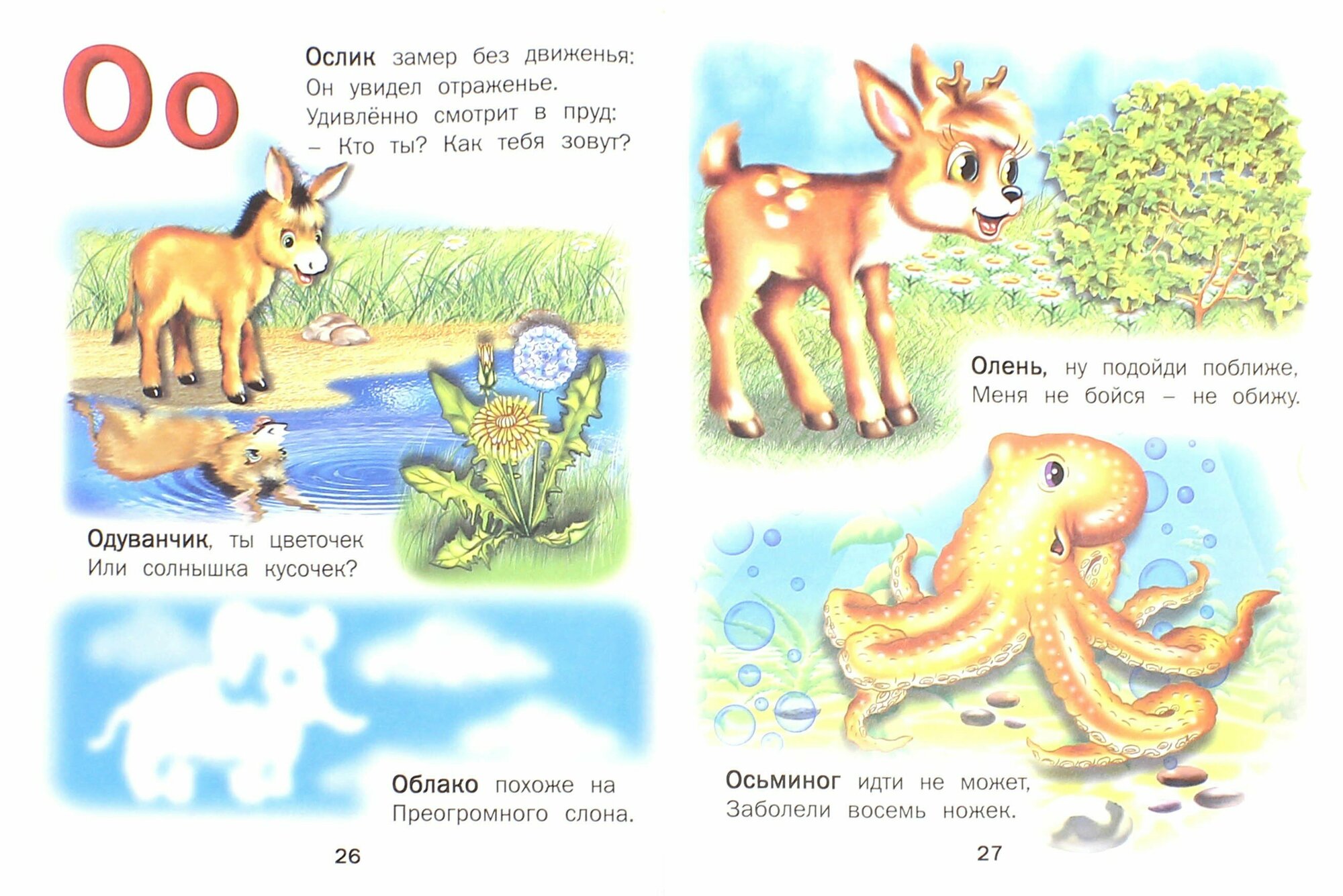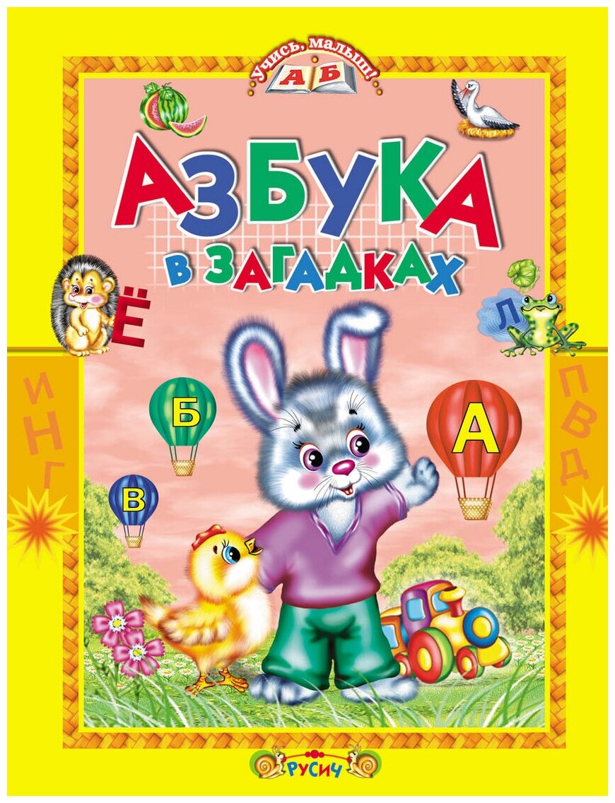 Хорошая книжка с яркими забавными рисунками, крупный шрифт, белые плотные листы. Почему только называется азбука в загадках не очень понятно, загадки далеко не к каждой букве, а вот стихи даже по нескольку есть к каждой букве. Загадки представлены про животных, птиц, (аист, белка,зайчик, мартышки...) и одна загадка про елку. а вот стихи не только про братьев наших меньших. Стихи простые (двустишия, четверостишия) можно читать и совсем маленьким деткам, а буквы можно и потом изучить.