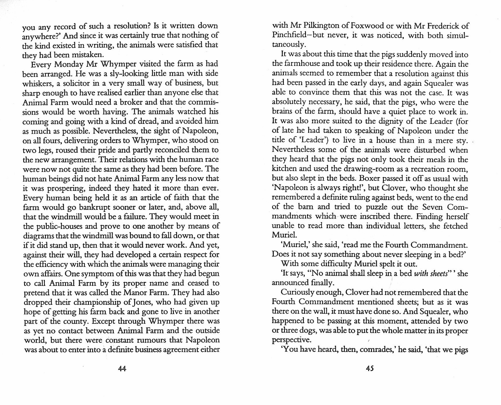 постройка животными мельницы «светлого социалистического будущего». И поиск таких деталей и аллюзий на реальные события только добавляет удовольствия при чтении. Хотелось встать и начать аплодировать Оруэллу – так едко, так тонко, так правдиво. Заставляет задуматься о неизбежности той траектории, которую описывает любое общество в своем развитии, и которую невозможно изменить, просто потому что нет таких понятий как абсолютная свобода и всеобщее равенство хоть в какой малой соц. группе, которая хочет функционировать и не развалиться.