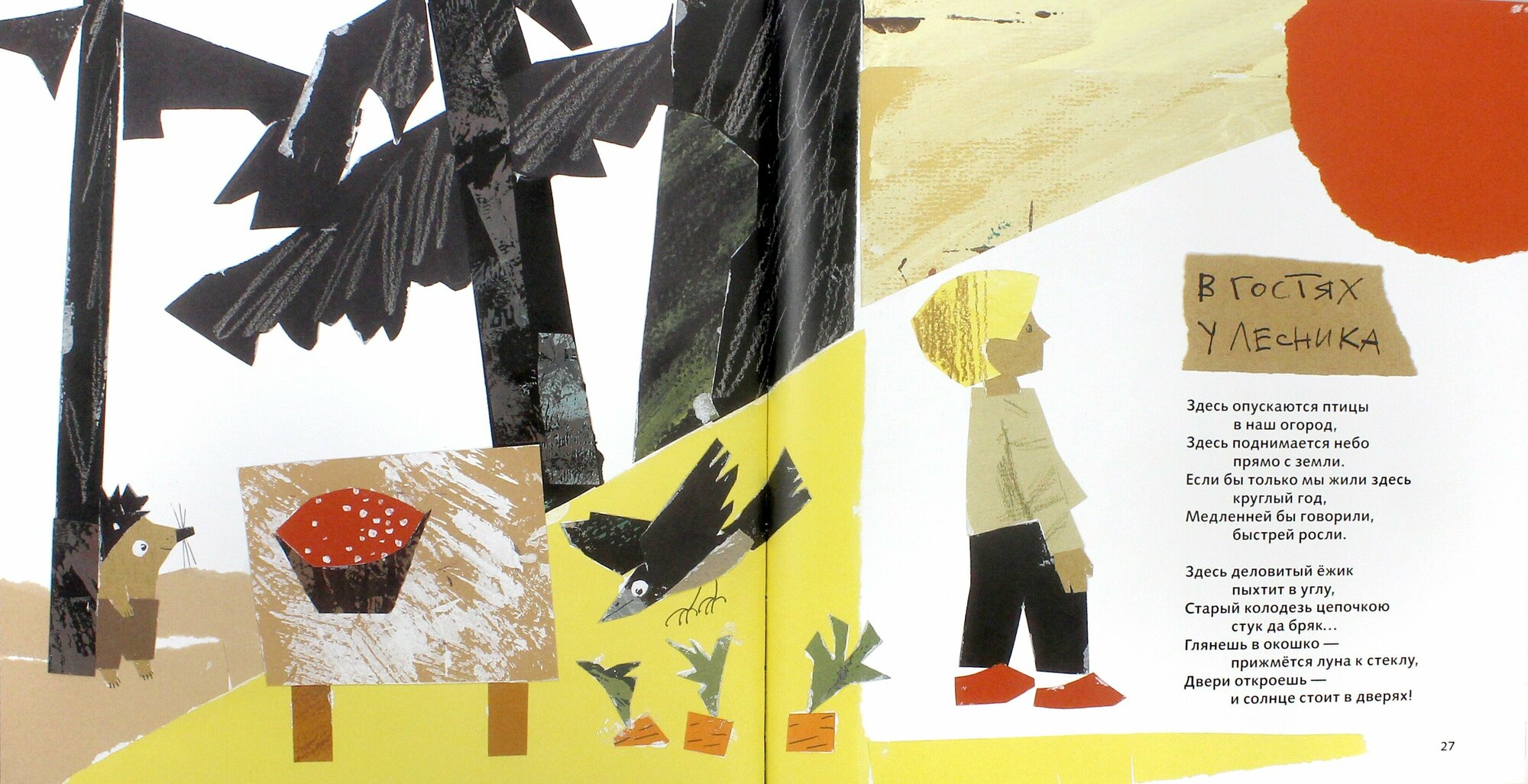 Мимо этой книги не смогла пройти, так как в ней отличный тандем автора и художника. Я всегда любила иллюстрации Надежды Бугославской: её Пеппи и Кыш украшают нашу полочку. Иллюстрации Надежды невозможно перепутать, у неё свой стиль, не похожий на другие. Все персонажи всегда немного угловаты, но это лишь придаёт им индивидуальность. В этой книге меня сначала испугал кубизм рисунков. Герои уже не просто угловатые, а состоящие из квадратов и треугольников. Все сомнения ушли, как только я взяла книгу в руки. Как метко художница передаёт настроение стихов, подмечает детали. И отпугнувший изначально кубизм притягивает снова и снова. Рисунки напоминают аппликации, а вся книга - детский дневник с повседневными заметками. У меня сложилось чувство, что благодаря иллюстрациям книга стала особенной, она выделяется среди других сборников.
