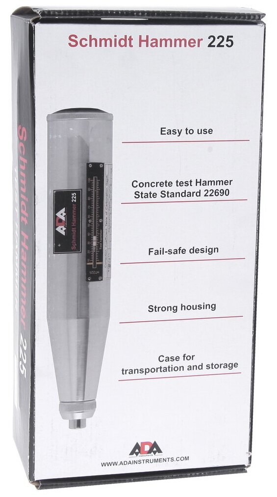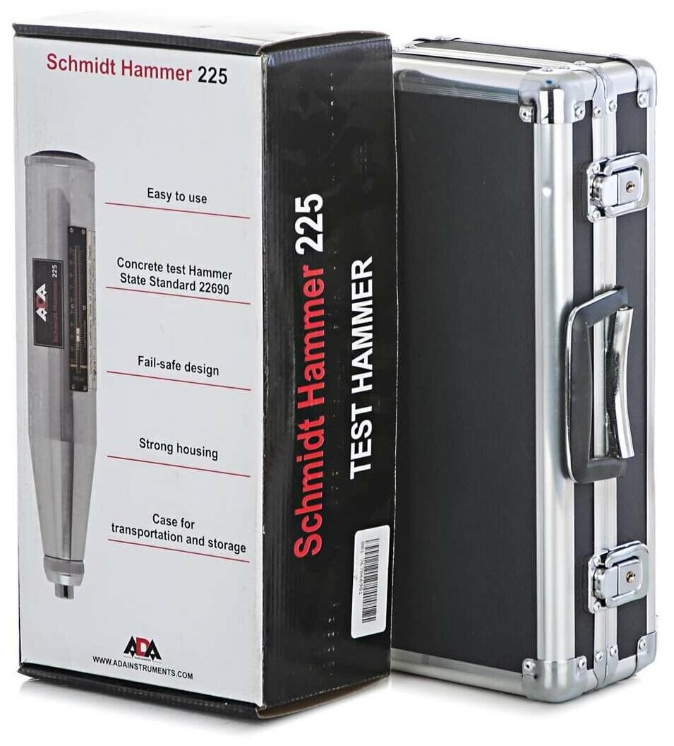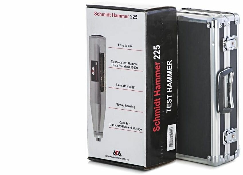 Измеритель прочности бетона (склерометр) ADA Schmidt Hammer 225 предназначен для определения прочности бетона в бетонных и железобетонных конструкциях и изделиях методом упругого отскока. Контроль прочности бетона производится по ГОСТ 22690.