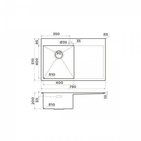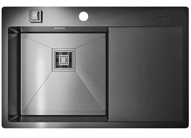Мойка Omoikiri AKISAME 78 ручной работы из высококачественной хромоникелевой нержавеющей стали с покрытием PVD и расположенным справа крылом подходит для установки вровень со столешницей или врезной установки. Специальная обработка и резиновые накладки снижают уровень шума от воды, а матовая полировка защищает от царапин.