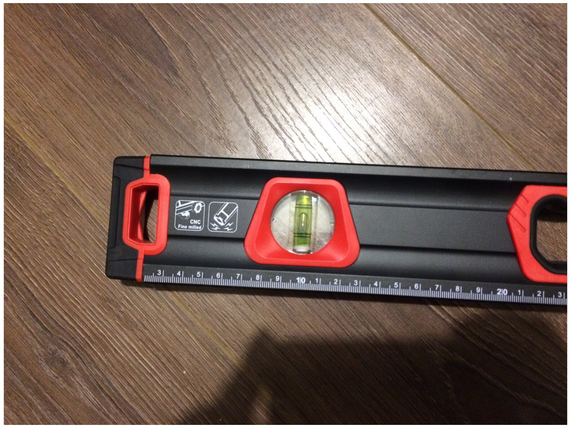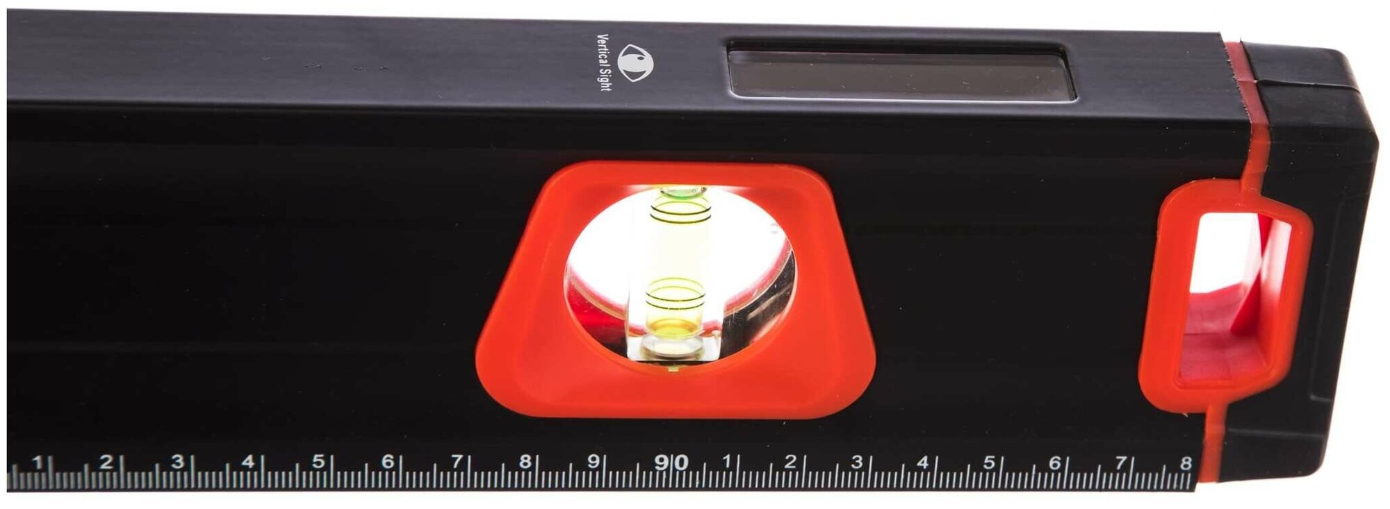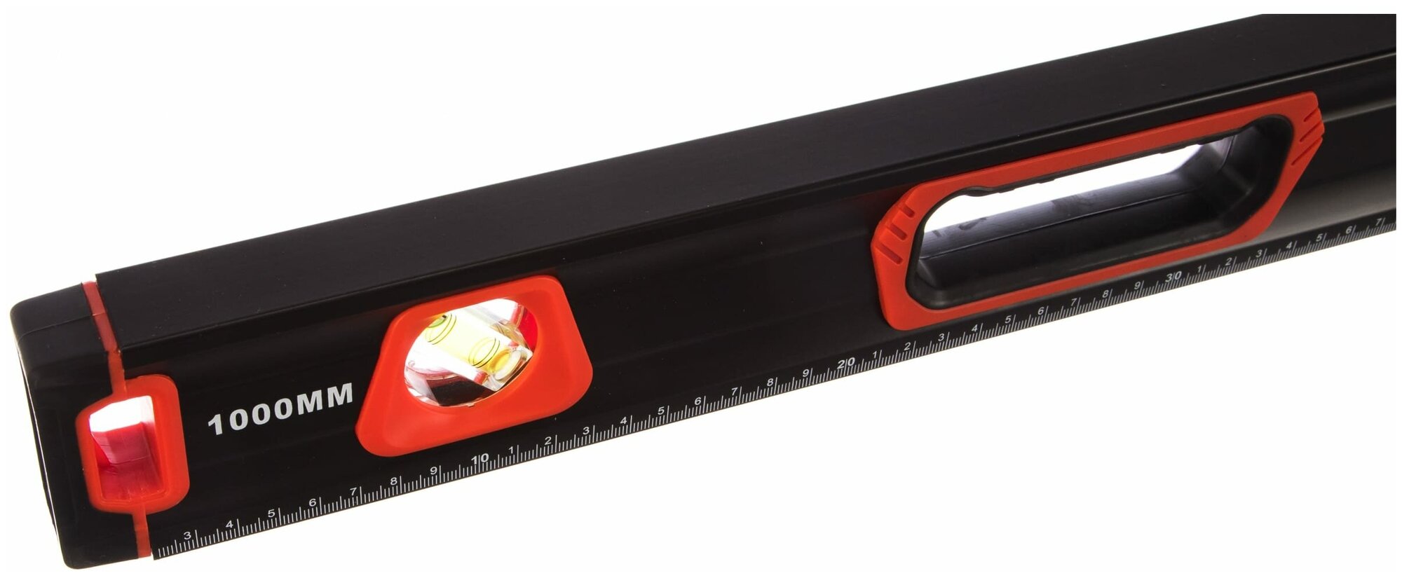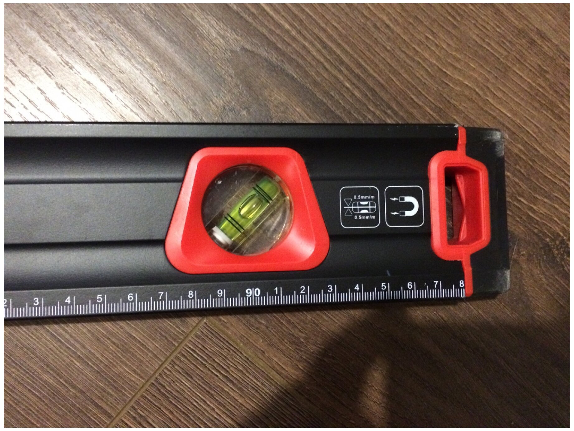 Линейка в миллиметрах. Вдоль рабочей поверхности на обеих сторонах нанесена линейная оцифровка в миллиметрах. Два инструмента в одном: уровень и рулетка.