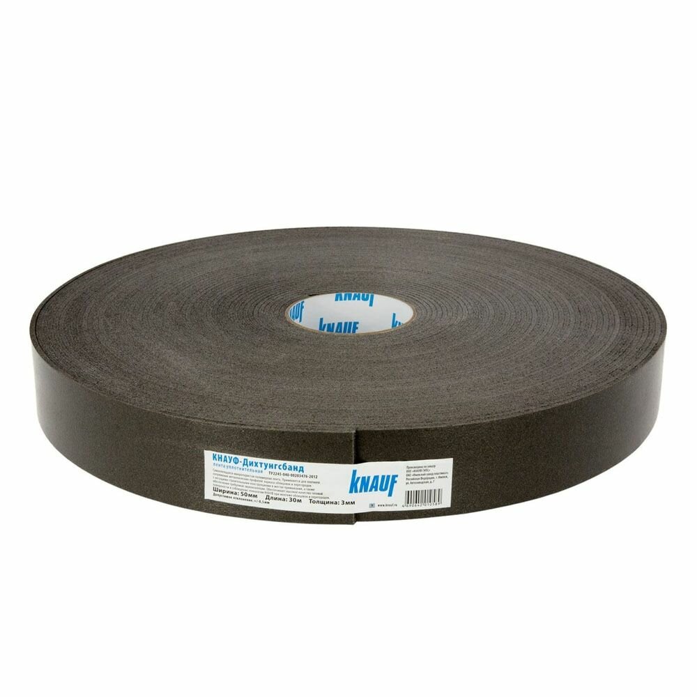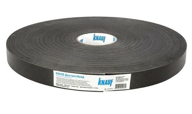 Лента уплотнительная Кнауф-Дихтунгсбанд из вспененного полиуретана со специальной пропиткой с одной стороны покрыта клеем, поэтому без проблем может наклеиваться на элементы несущей конструкции. Она создает плотную и более крепкую связку в местах соединения, например, бетона и направляющего профиля, а также может использоваться в местах крепления П-кронштейнов. Кроме того, лента обеспечивает дополнительную звукоизоляцию, теплоизоляцию и виброизоляцию. Может наклеиваться на воздуховоды для плотного соединения и даже под металлические хомуты. Ширина ленты - 3 см, длина - 3000 см.