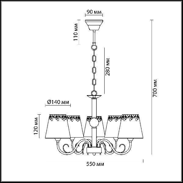 5-рожковая конструкция выполнена из металла, устойчивого к коррозии и механическим повреждениям. Цвет - античная бронза. Плафоны белого цвета изготовлены из текстиля, украшены по краю золотистым узором. Подвес декорирован цепью, регулируется по длине. Люстра подходит для высоких и средних потолков. Изделие практичное и долговечное.