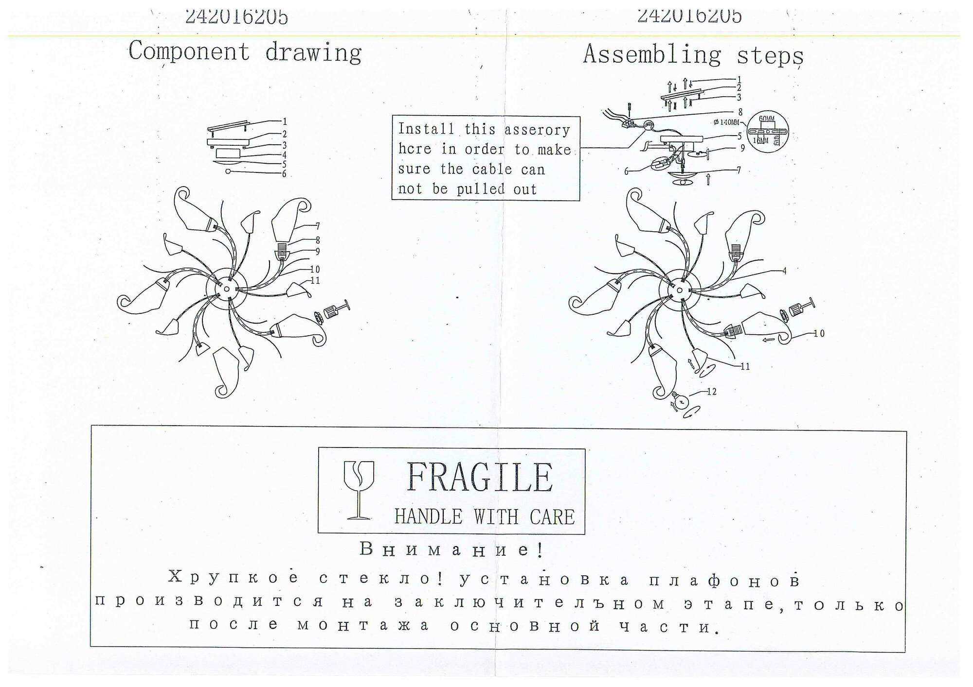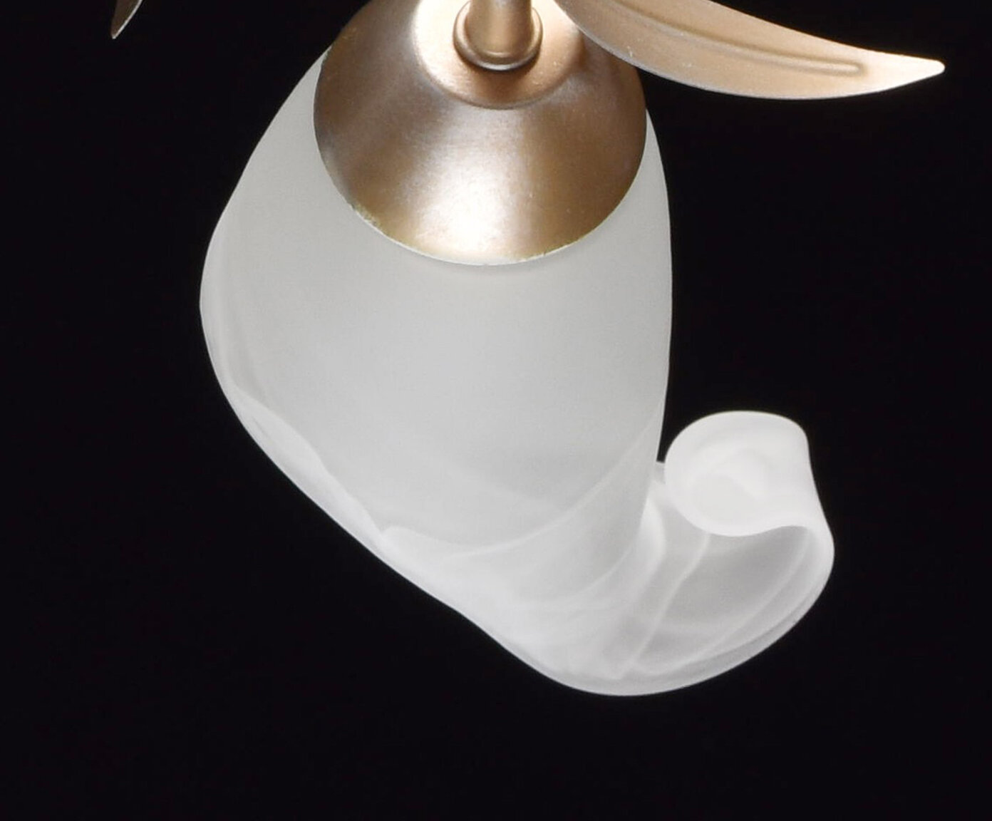 Конструкция представляет собой сплав железа, а окраска выполнена по технологии хай-лай. Материалы изготовления элементов декора: листья - сплав железа, цветы из глазурованного фарфора. Плафоны выполнены из гутного стекла с добавлением алебастра. Материал красиво преломляет свет, наполняя комнату мягким свечением. Готовое изделие отличается повышенными прочностными характеристиками. Не требует особого ухода.