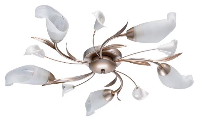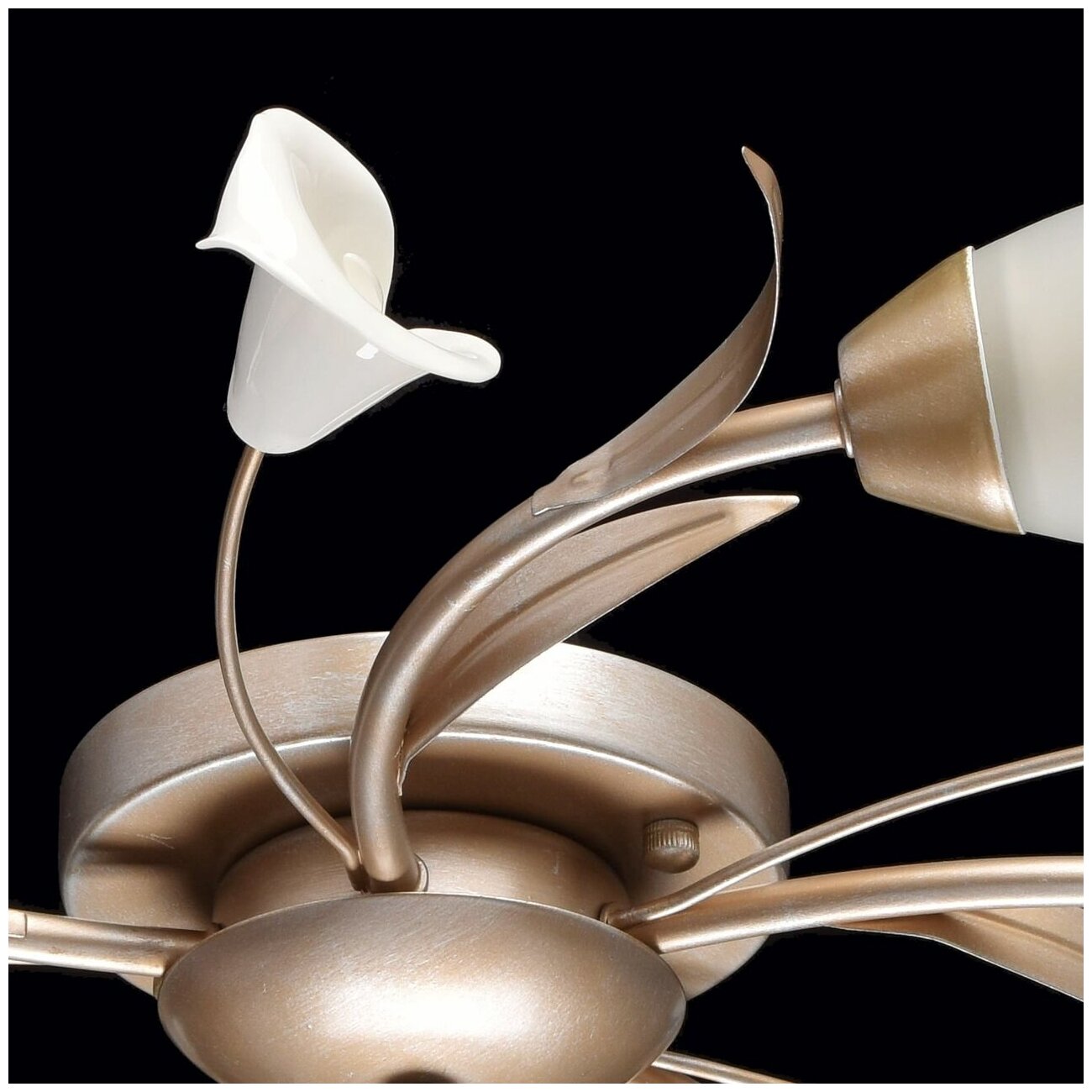 Красивая потолочная люстра в современном дизайне с элементами цветочных мотивов подходит для интерьеров в стиле модерн, неоклассика или кантри. Арматура выполнена в модном оттенке "шампань", плафоны в форме бутонов чистого белого цвета. Флористический дизайн, выполненный в трендовых оттенках, выигрышно дополнит внутреннее оформление гостиной, спальни или холла.