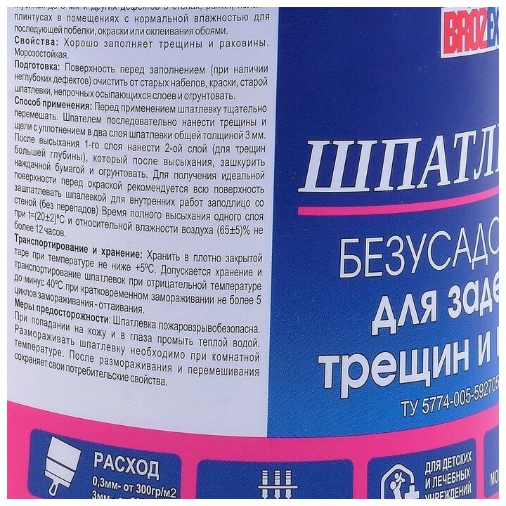 При работе с материалом температура воздуха не должна быть ниже 10 градусов. Для лучшего сцепления с гладкой или плохо впитывающей поверхностью перед применением шпаклёвки используется грунтовка. Расход материала в зависимости от вида работ может варьироваться от 0,25 (заделка стыков) до 1,5 кг на 1 кв.м. Смесь упаковывается в бумажные мешки по 5 кг. Срок хранения в неповрежденной упаковке 6 месяцев.