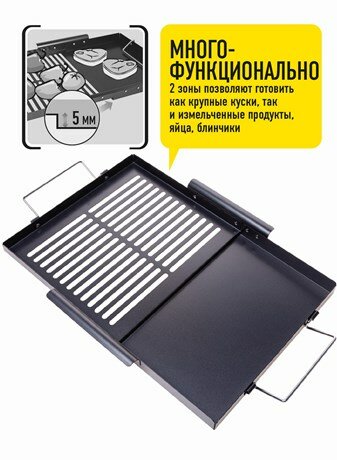 Противень-гриль Forester BQ-N15 имеет две рабочие гриль-зоны, которые позволяют готовить как крупные стейки, так и мелко нарезанные продукты. Причем делать это можно одновременно: размеры поверхности позволяют разместить ингредиенты для различных блюд или нескольких порций на большую компанию. Например, мясо в виде стейков, небольшую рыбу целиком и овощи-гриль на пикнике это будет выгодно и сэкономит время. Полоски и решеточка на противне оставляют на продуктах характерный рисунок.