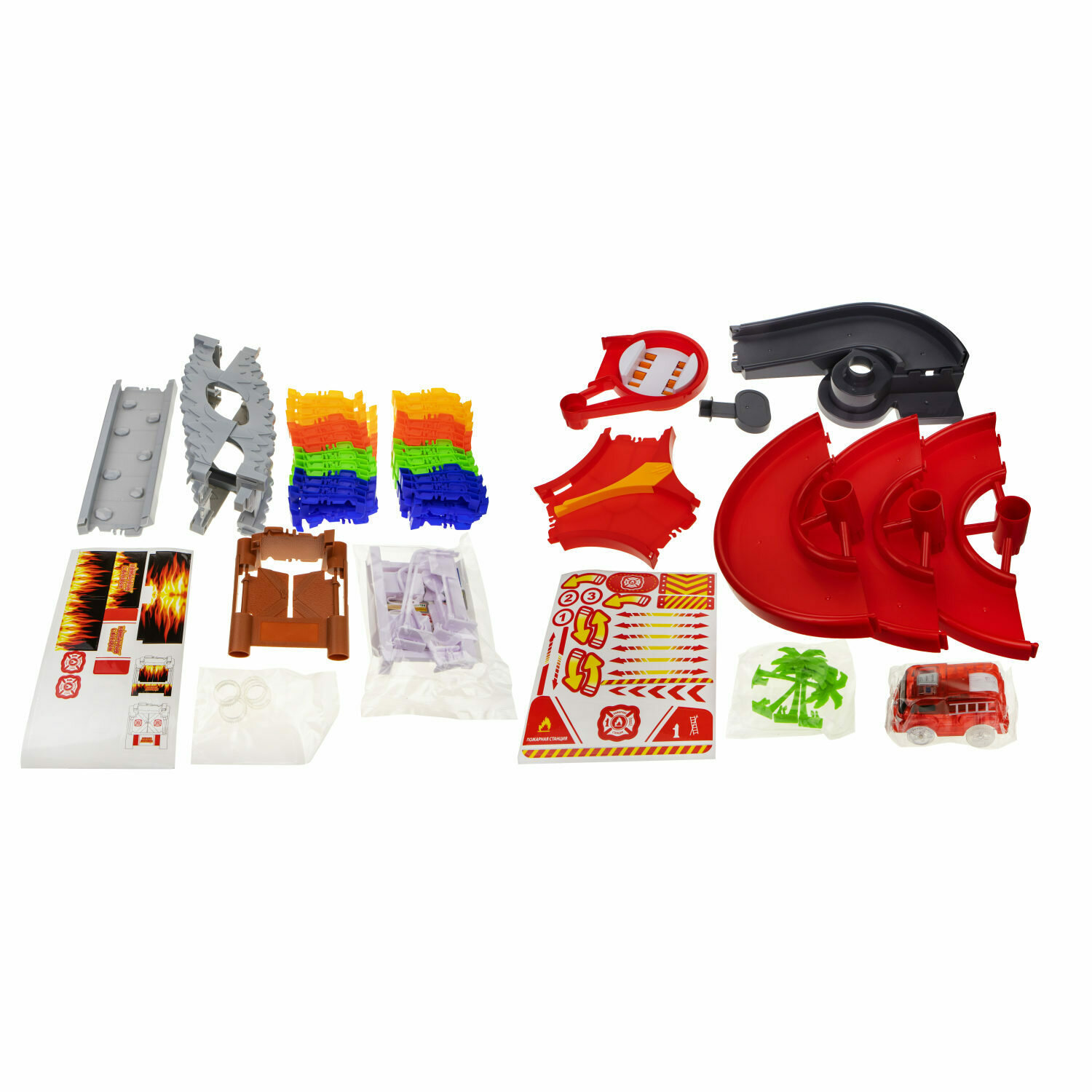 Наборы серии Гибкий трек задают новый тренд традиционной игре с машинками. Дорогу можно не просто собрать так, чтобы она поворачивала и петляла в разные стороны (благодаря специальным деталькам-рельсам), но также сделать выпуклой или вогнутой или вообще закольцевать, заставив машинку ехать внутри нее, словно хомячок внутри специального круга. В наборе Гибкий трек Пожарная станция множество дополнительных аксессуаров - мост, по которому можно проезжать над одним из участков трассы, стрелка, парковка с разворотом, всего более 100 элементов!