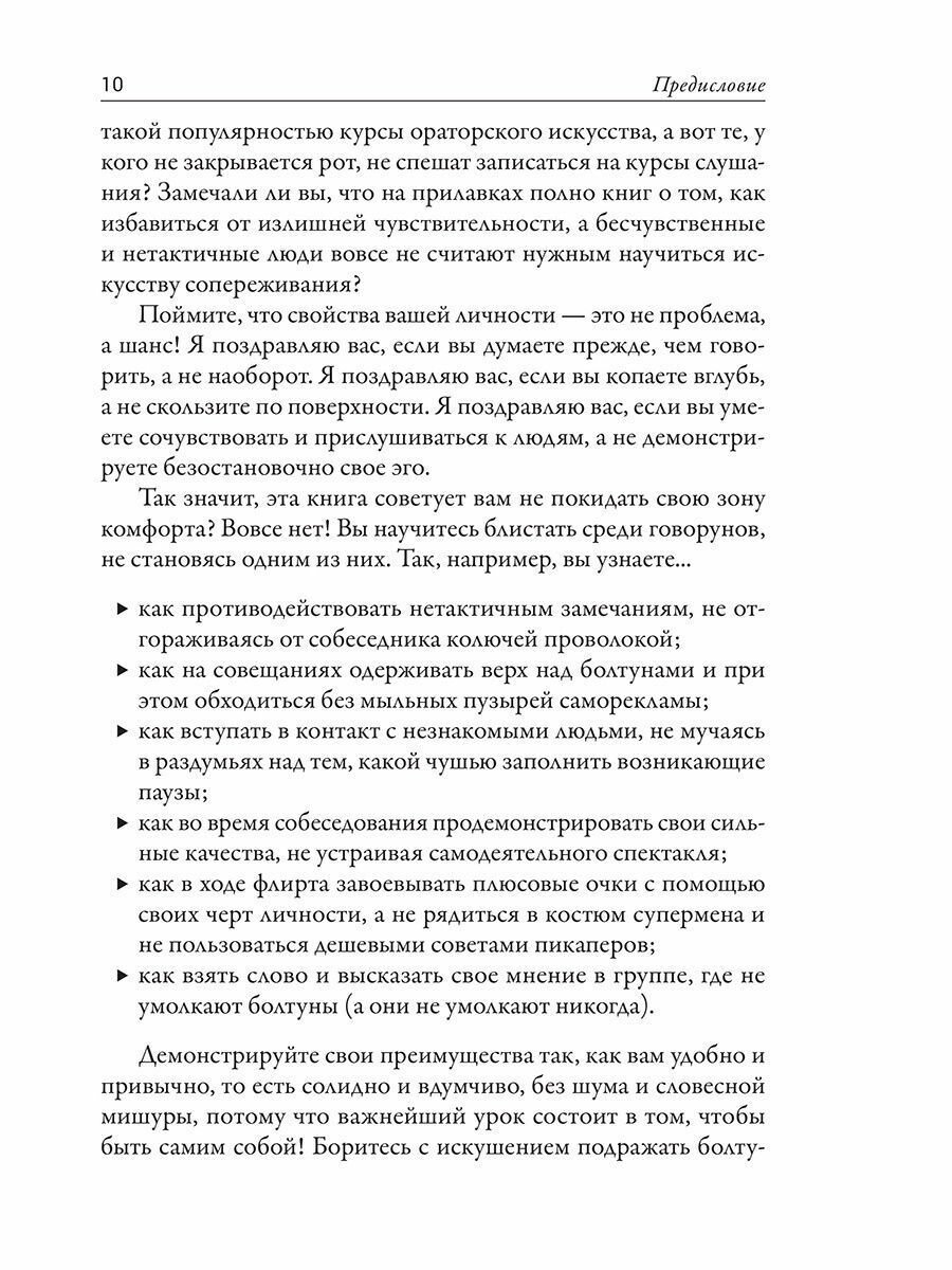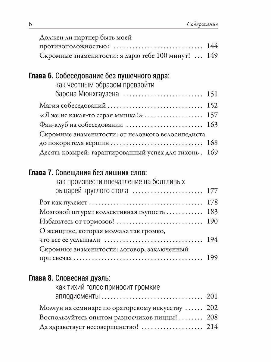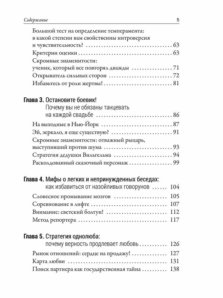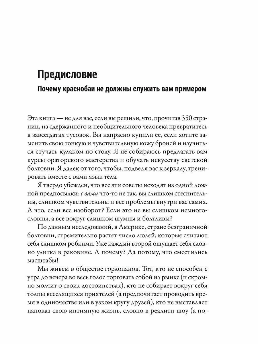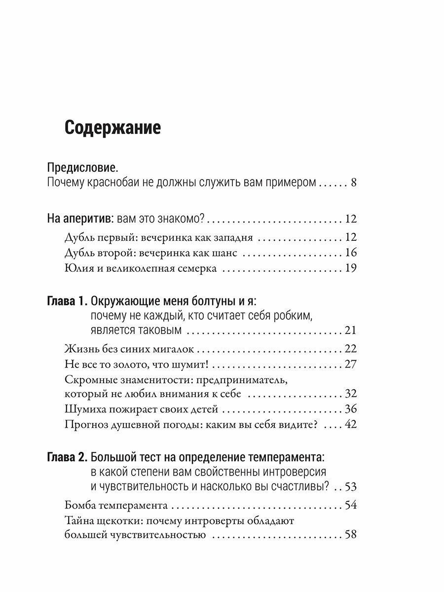 Довольно полезная книга для интровертов, или всех кто считает себя таковыми. Вначале дается тест на определение темперамента, а также интересная теория про интроверсию, далее уже идут советы по конкретным областям жизни. Книга написана интересным живым языком, с долей иронии. Легко читается, и честно признаться, во многих моментах узнавала себя. Дается много полезных стратегий и примеров из жизни людей, причем не каких-то банальных и пространных, как в типичных зарубежных книжках по психологии, а весьма жизненных, ярких и запоминающихся. Лично мне очень помогли многие советы из этой книги, особенно из разряда "как противостоять нетактичным замечаниям"