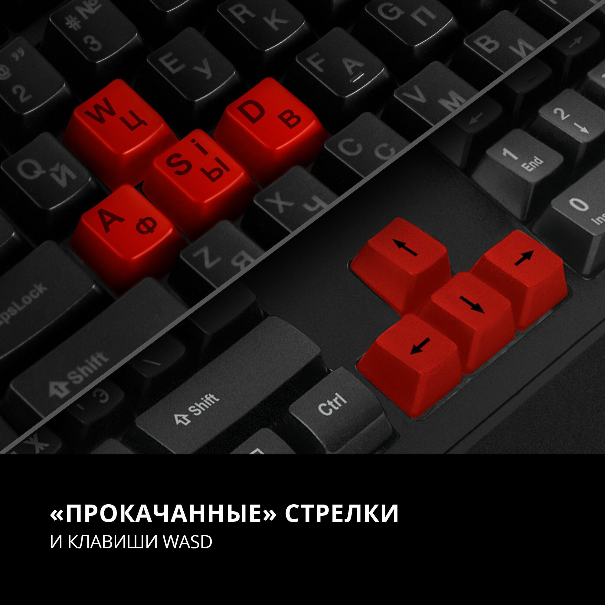 клавиатура мембранная, имеет тактильную обратную связь. клавиши не залипают, отклик быстрый, на некоторых из них можно изменить функции. стрелки и кнопки wasd красные, но есть еще сменные черные кнопки. кабель в плотной оплетке длинной полтора метра