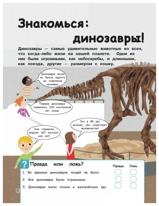 Сыну 3 года, начал интересоваться динозаврами и поэтому я решила купить что-то типа энциклопедии, но так чтобы рисунков было больше и букв меньше. Эта книга сыну очень понравилась, в первое время читали по 3 раза в день, задания он пока не делает, не хочет, а вот названия динозавров выучил и про их жизнь он слушает с удовольствием. Поэтому советую брать детям с 3х лет, которые увлекаются динозаврами, как первую энциклопедию, что-то типа отправной точки. На данный момент ищем книжку с большей информацией