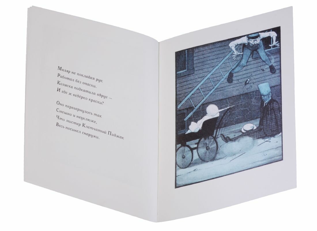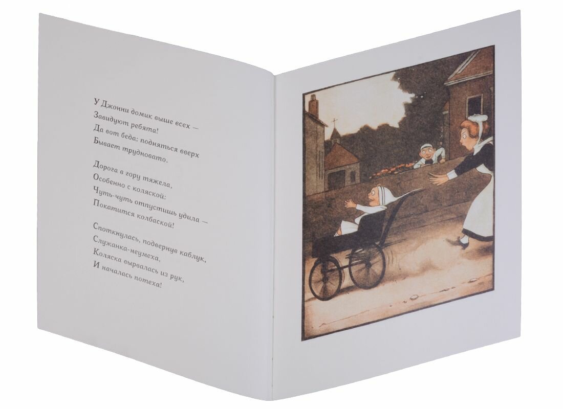 "Книга с уклоном" издается более 100 лет, и до сих пор любима родителями, детьми и, конечно, библиофилами. Действие в ней определяется ее необычной формой: тяжелая коляска вырвалась из рук нерадивой нянюшки - и понеслась под откос... Остроумная и новаторская книжка-картинка Питера Ньюэлла появилась одновременно с немыми комедиями Бастера Китона и устроена по тому же принципу: герой, попав в необычную ситуацию, стремительно мчится вперёд, создавая веселый переполох и сея комедийные разрушения.