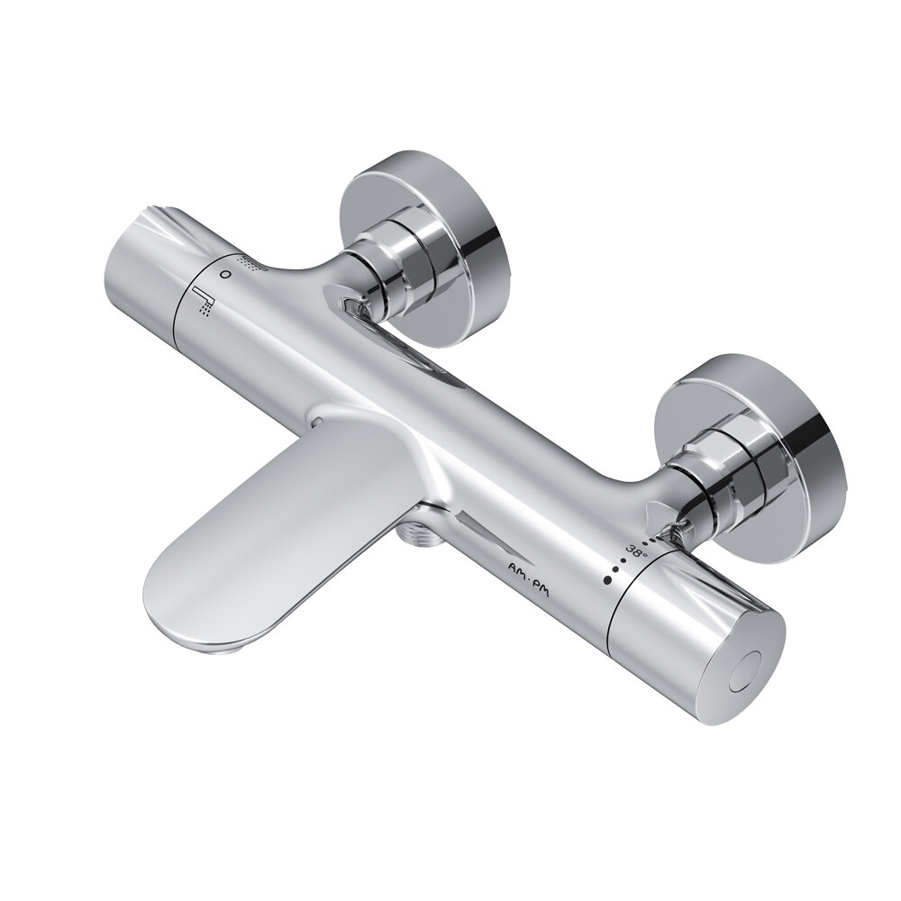 Смеситель устанавливается на стену в ванной или душевой. Для крепления к жесткой подводке в комплекте предусмотрены S-образные эксцентрики. Монтажные отверстия декорируются металлическими чашками.