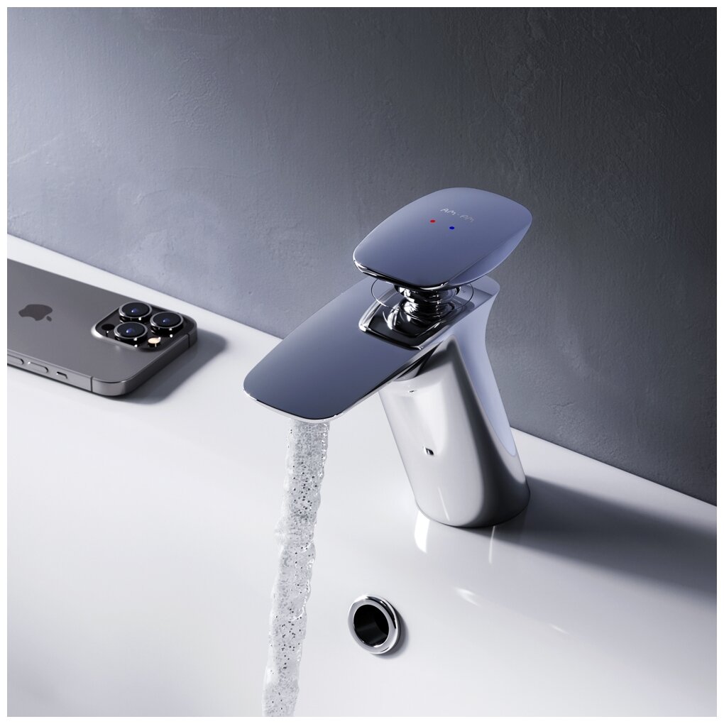 - Удобный наклон и плавный изгиб корпуса позволяют с комфортом использовать смеситель на высокой раковине.