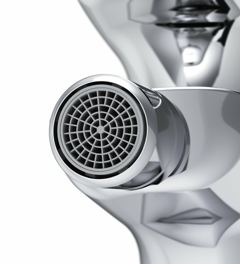 - Аэратор Rub&Clean насыщает струю воздухом, обеспечивает равномерный поток без брызг. Деталь легко снимается и чистится вручную.