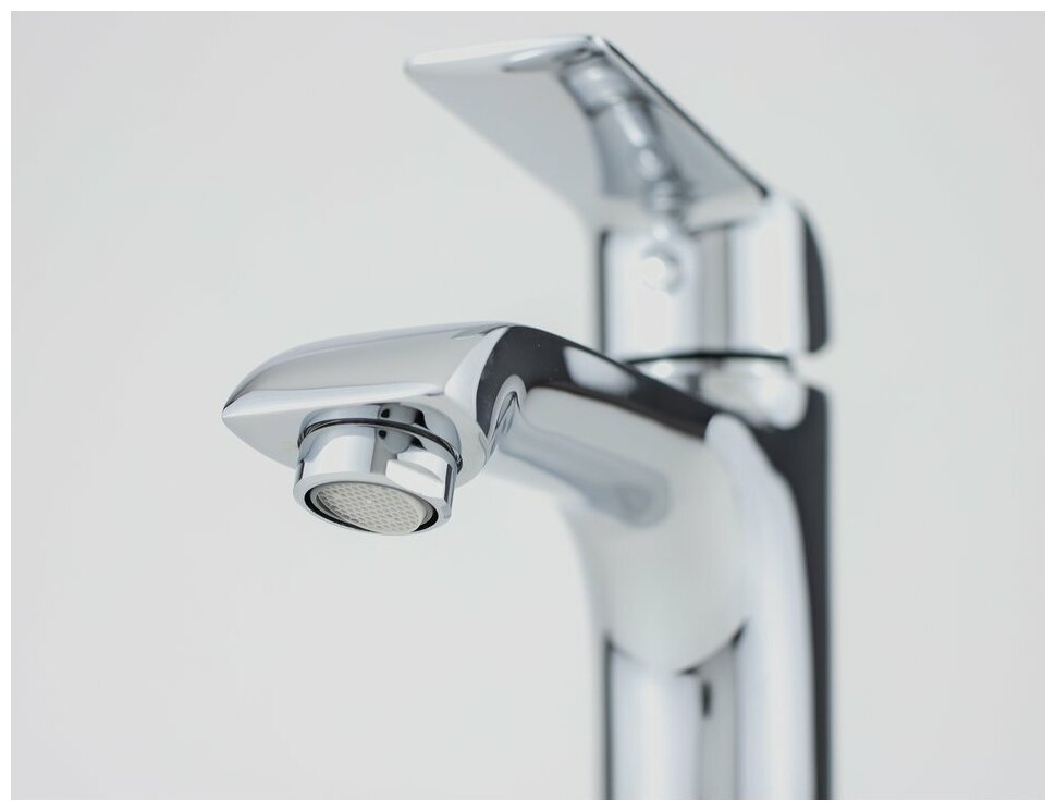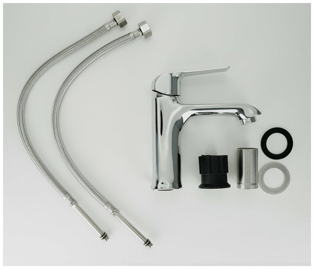 Ручка удобной формы. Корпус изделия прочный, цельнолитой, выполнен из латуни высокого качества. Хромированное покрытие обеспечивает декоративный эффект и защиту от коррозии и механических повреждений. Контроль смешивания горячей и холодной воды обеспечивается керамическим картриджем. В комплектации: крепление, гибкая подводка для воды.