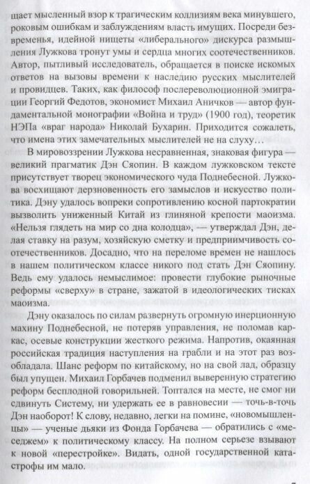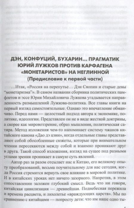 Книга Юрия Лужкова - своеобразный синтез профессиональной аналитики и политической сатиры. Автор рассуждает о событиях нашего недавнего прошлого, трудном и мучительном становлении новой государственности после крушения сверхдержавы в августе 1991 года. Московский градоначальник был одним из пятерки ведущих и самостоятельных политиков нового Смутного времени. Образ мыслей автора раз за разом отсылает нас к Китаю, его великому опыту преобразований, весьма поучительному для нас сегодня, когда Россия стремится вернуть свое влияние в мировой политике.