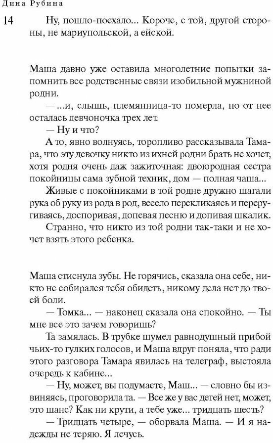 Поражаюсь фантазии автора, Дина Ильинична просто неиссякаемый источник невозможно-жизненных историй – да-да, именно так, потому что в её книгах очень просто – гениально) просто и ясно изложено вот это самое сочетание, когда невозможное происходит в нашей повседневности и становится её частью. Пронзительный финал, очень уместен и красив, как закат в конце яркого дивного дня. Вроде бы описаны живые люди, а читаешь, словно рассматриваешь прекрасную картину. Не хочу спойлерить, начав рассказывать о сюжете, остановится будет сложно)), а портить новым читателям впечатление не хочу. Рекомендую! Великолепная книга!