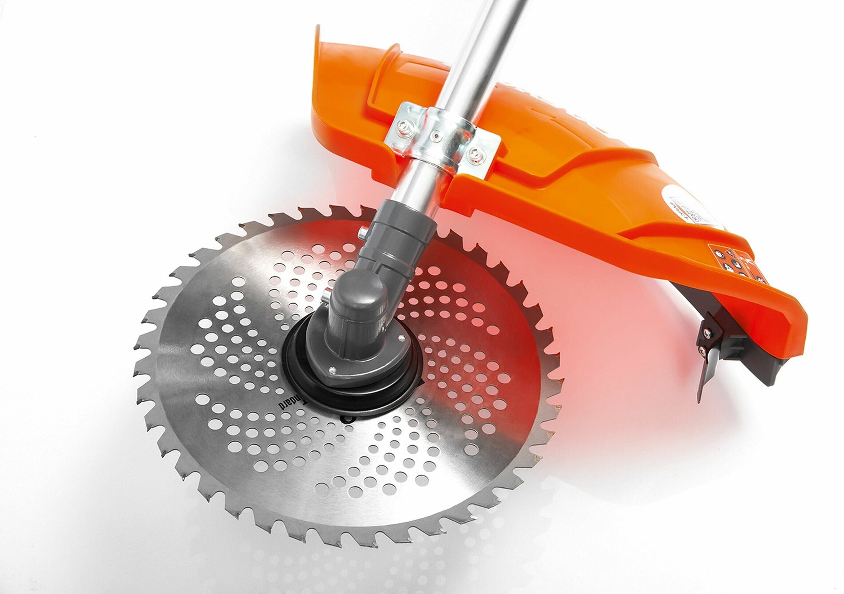 - Режущий диск из высокопрочной стали с 40 зубьями эффективно справляется с жесткой растительностью, сорняком и кустарником.