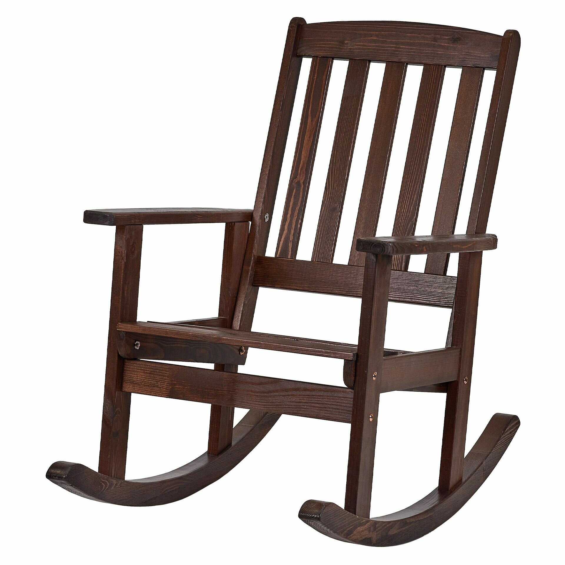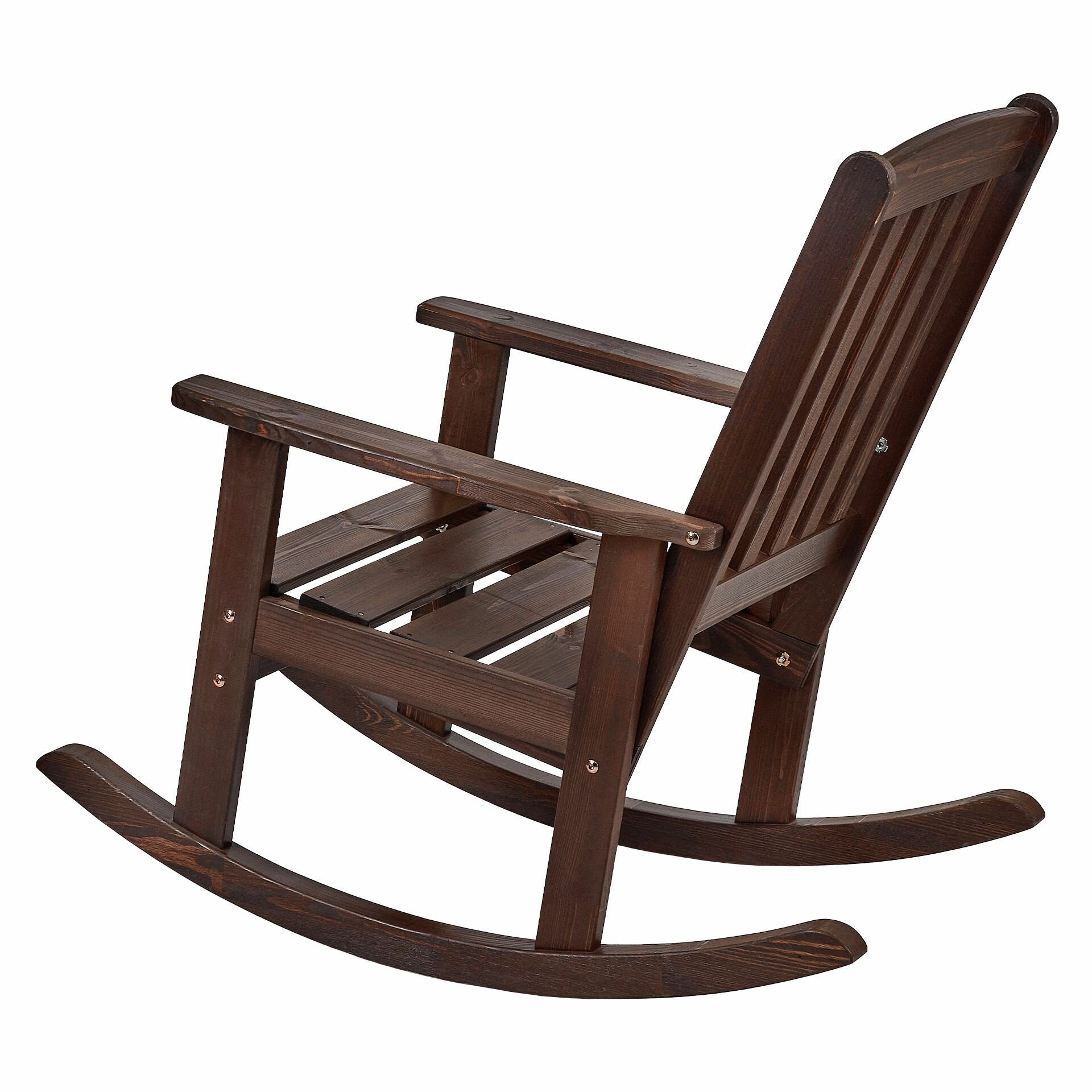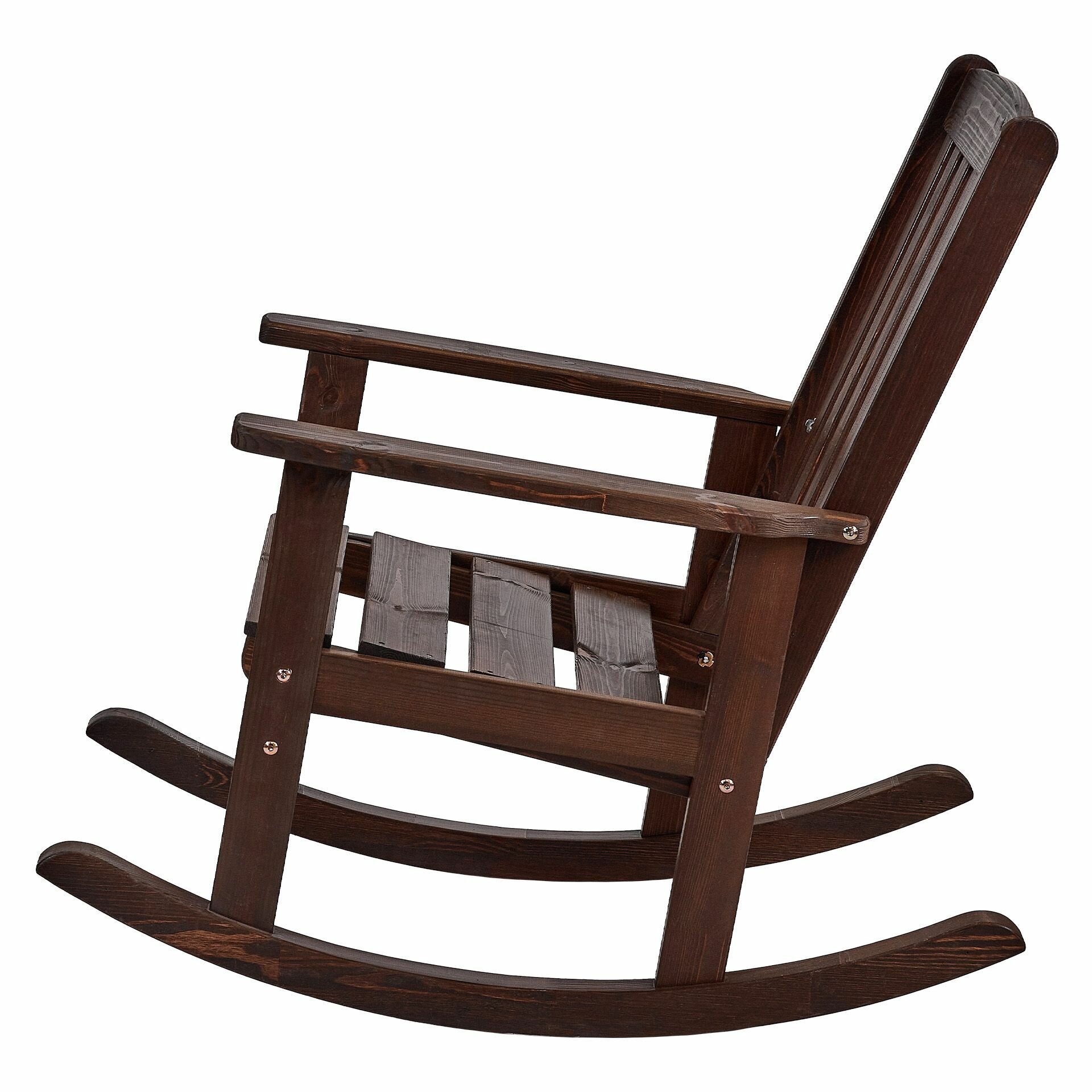 Кресло выполнено из массива сосны, тонированного в темно-коричневый цвет. Дуги качалки клееные бессучковые. Это гарантирует высокую степень сопротивляемости изломным воздействиям. Деревянное сидение и спинка расположены под оптимальным углом, что делает отдых в кресле максимально удобным и комфортным. Все соединительные узлы шиповано-клееные, изготовители использовали швейцарскую нержавеющую анодированную фурнитуру известного производителя Bufab. В комплекте с качалкой идет мягкая подушка из прочной водо- и пыленепроницаемой ткани желто-коричневой расцветки. Рисунок в клетку и теплая цветовая гамма помогают настроиться на позитивный лад, а размеренное покачивание в кресле - снять напряжение.