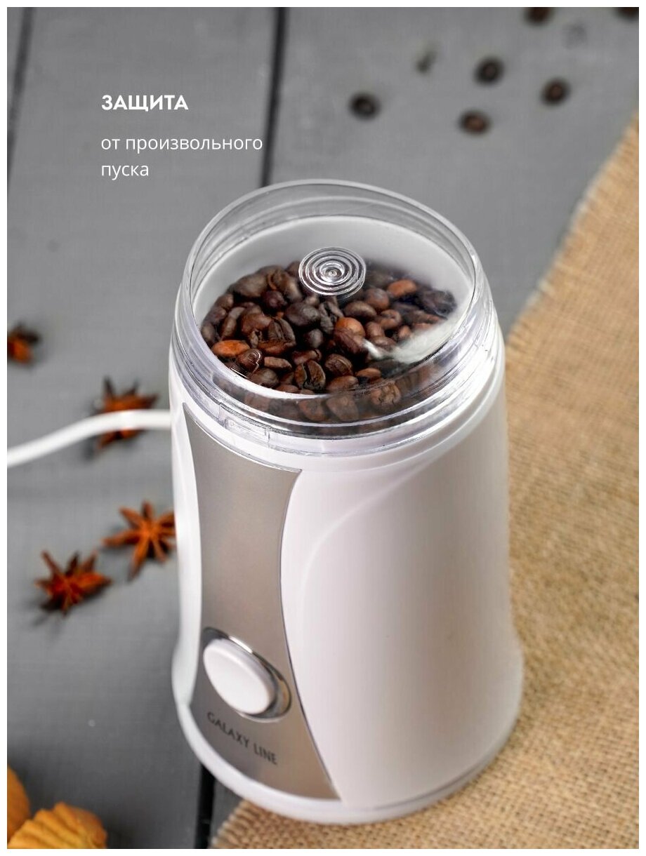 Кофемолка Galaxy станет незаменимой техникой на кухне любителей крепкого и бодрящего кофе по утрам. Представленная модель отличается присутствием ротационного ножа в конструкции прибора, отвечающего за идеальный помол кофейных зерен. При этом Galaxy можно с уверенностью назвать энергосберегающим устройством, ведь на выполнение своей основной функции он тратит всего лишь 250 Вт электроэнергии.