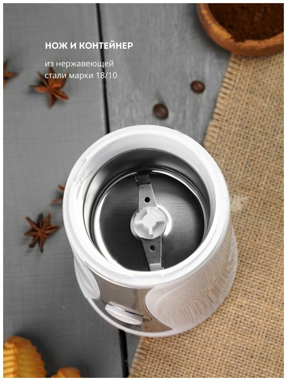 Электрическая кофемолка имеет стильный дизайн и выполнена в пластиковом корпусе. Нож и контейнер у данной модели выполнены из нержавеющей стали. Принцип помола прост – зерна измельчаются при помощи встроенного ротационного ножа (что гораздо проще, чем работа с ручной кофемолкой). Нож вмонтирован в измельчитель и в процессе работы «разрубает» зерна на разные по размеру частицы. Чем дольше будет работать такая кофемолка, тем меньшего размера будут получаться частицы зерен.